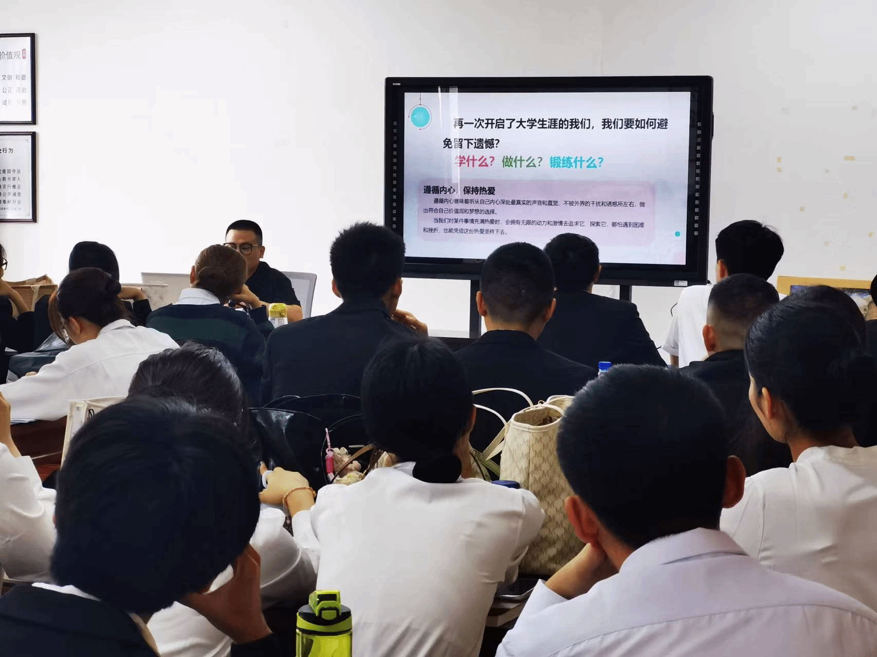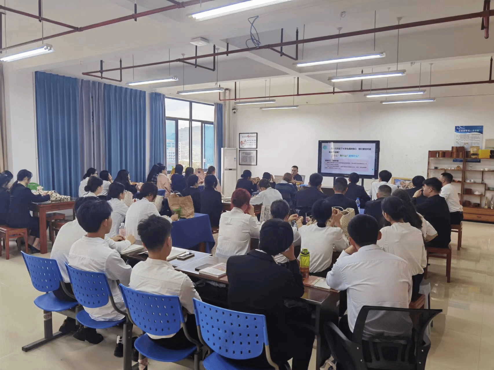 此外,讲座还特别邀请了18旅管专升本班毕业的优秀校友谢玮鑫进行了主题为《学旅游管理的我》的分享。他结合自身的工作经验,向新生们分享了旅游行业的最新动态和职业发展路径。他还鼓励大家要勇于实践,珍惜校园时光,不断提升自己的专业素养和实践能力,为未来的职业发展打下坚实的基础。