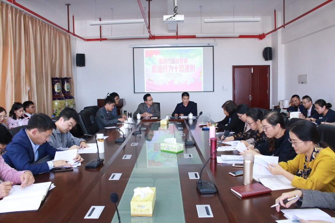 本次大会共有两个议程。第一个议程为开展师风师德专题理论学习,会上学习了《新时代高校教师职业行为十项准则》和《教育部关于高校教师师德失范行为处理的指导意见》的重要精神,副院长吴盛汉重点解读了新时代下高校教师职业行为的基本规范。他强调,习近平总书记在全国教育大会上,对加强教师队伍建设提出了新的更高的要求,全院教职工应认真学习文件精神,将文件精神落实到具体工作当中,做到“知准则、守底线”,要围绕立德树人的根本任务,牢记使命、不忘初心、爱岗敬业、教书育人、改革创新、服务社会,做一名无愧于党和人民的教师。
