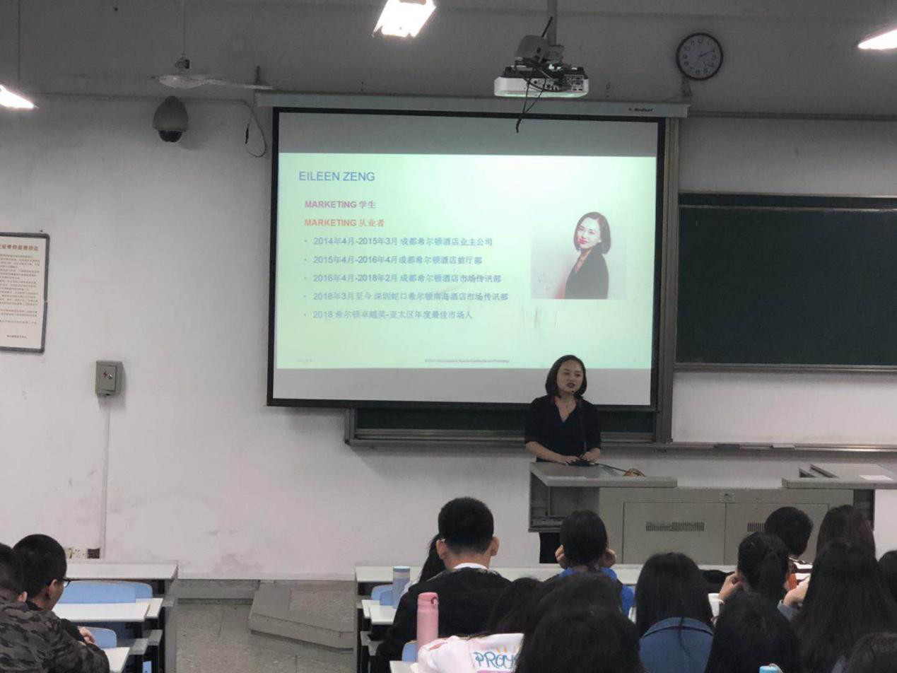4月11日下午,希尔顿班在文207开课,深圳蛇口希尔顿南酒店市场传讯总监Eileen Zeng担任主讲。