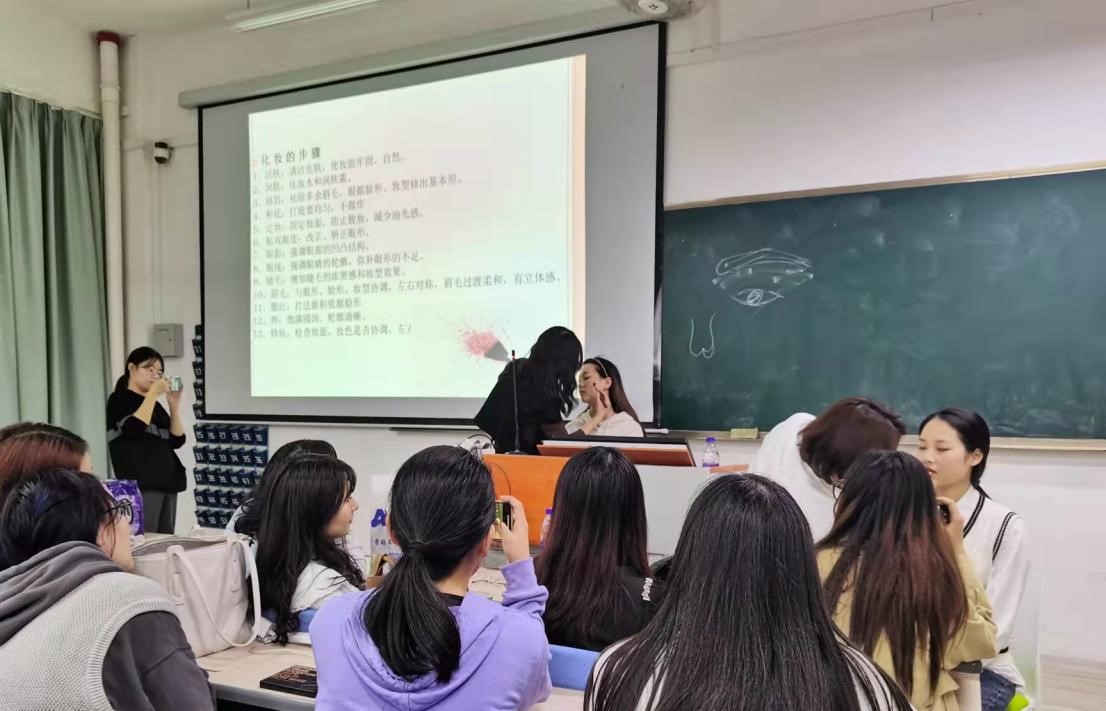 为了深入推进业界优秀人才作为应用型师资与校内教师“双师同堂”开展课程教学活动,提高教学质量,11月2日下午,经管学院《旅游礼仪》专任教师蒋晨丽邀请龙岩市卫娜美业创始人、国家一级化妆师吕卫娜为2020级旅游管理专业学生开展美妆护肤实践教学活动。在实践教学课堂上,吕卫娜详细介绍了美妆护肤的相关知识,并挑选两名学生进行现场美妆示范。课堂气氛活跃,学生们受益匪浅。