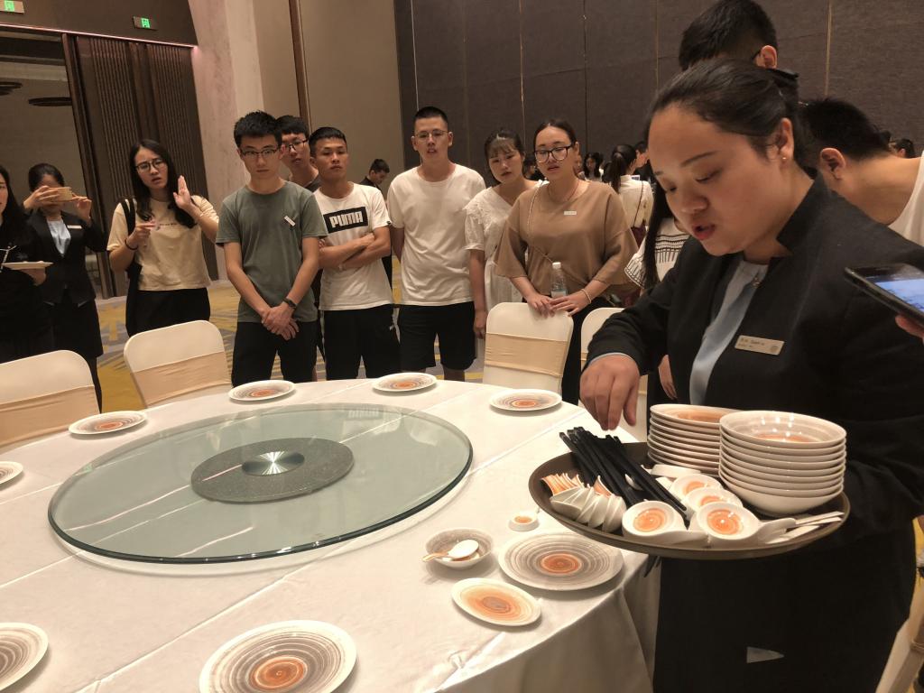 参观结束后,不同酒店进行了不同形式的现场教学。龙岩佰翔京华酒店人力资源经理张苗苗女士带领同事们向同学们展示了中餐摆台和铺床,同学们纷纷动手演练,学习热情高!龙岩财富酒店总经理陈春梅女士和总经理助理吴锦华先生、龙岩华美达龙州酒店总经理廖秀金女士和人力资源总监陈小蓉女士、龙岩万达嘉华酒店人力资源经理江丽萍女士在不同的时间,都与同学们进行了座谈交流,会上各酒店都介绍了自身的经营管理特色,人才培养及员工激励机制等,同时也寄语同学们,希望他们能利用课余时间深入了解酒店的基层运作,理论联系实际,为将来投身酒店管理工作打下坚实的基础。与会的同学代表也认真谈了自己的参观感受,并感谢酒店的热情接待。