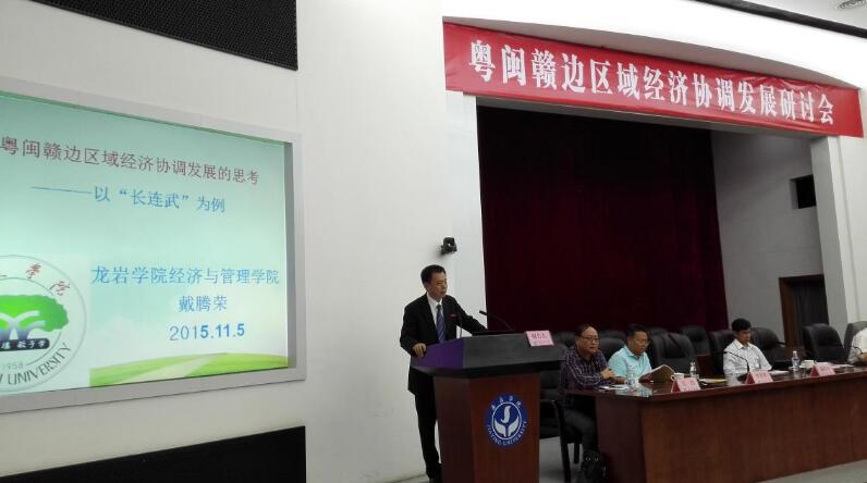 会上,我院领导老师与来自福建师范大学、厦门理工学院、赣南师范学院、广东财经大学、嘉应学院、广东省社科院、梅州市宣传部等相关领导、专家、学者共同探讨区域经济协调与产业持续发展等领域的新思想与新成果。戴腾荣老师的《欠发达地区经济发展路径选择的哲学思考》、郑国诜博士的《新常态下龙岩市现代物流业发展趋势与对策研究》入选会议论文集。戴腾荣老师还作了《粤闽赣边区经济协调发展的思考——以“长连武”为例》的特邀专家主题报告并获得与会代表的一致好评。