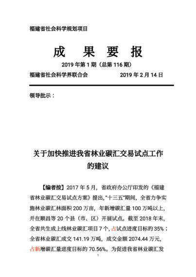 日前,由经管学院副院长黄可权博士主持完成的省社科规划项目《福建省林业碳汇交易机制与政策研究》阶段性成果《关于加快推进我省林业碳汇交易试点工作的建议》被省社科规划办采用,并在福建省社会科学界联合会主办的《成果要报》2019年第1期(总第116期)发表。