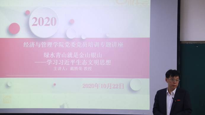 10月22日下午,经管学院分党委在厚414开展“绿水青山就是金山银山——学习习近平生态文明思想”的党员培训专题讲座,讲座由戴腾荣教授主讲,蔡立雄书记主持。