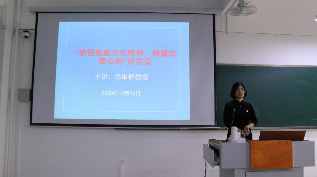 徐维群教授以“感悟客家文化精神,做廉洁奉公的好党员”为题,从什么是客家文化,保护客家文化的意义以及为什么要保护客家文化展开,并以亲身经历向大家展现客家文化的魅力,通过客家名人胡文虎、廖鸿章先生等事迹和结合客家家风家训文化启示大家要有坚定的理想信念,做一个孝悌仁爱,忠义和谐,德能双全的好党员;鼓励艰苦创业,勤俭持家,反对物质主义和懒惰倾向,不忘初心,为建设中国特色社会主义事业尽职尽责。