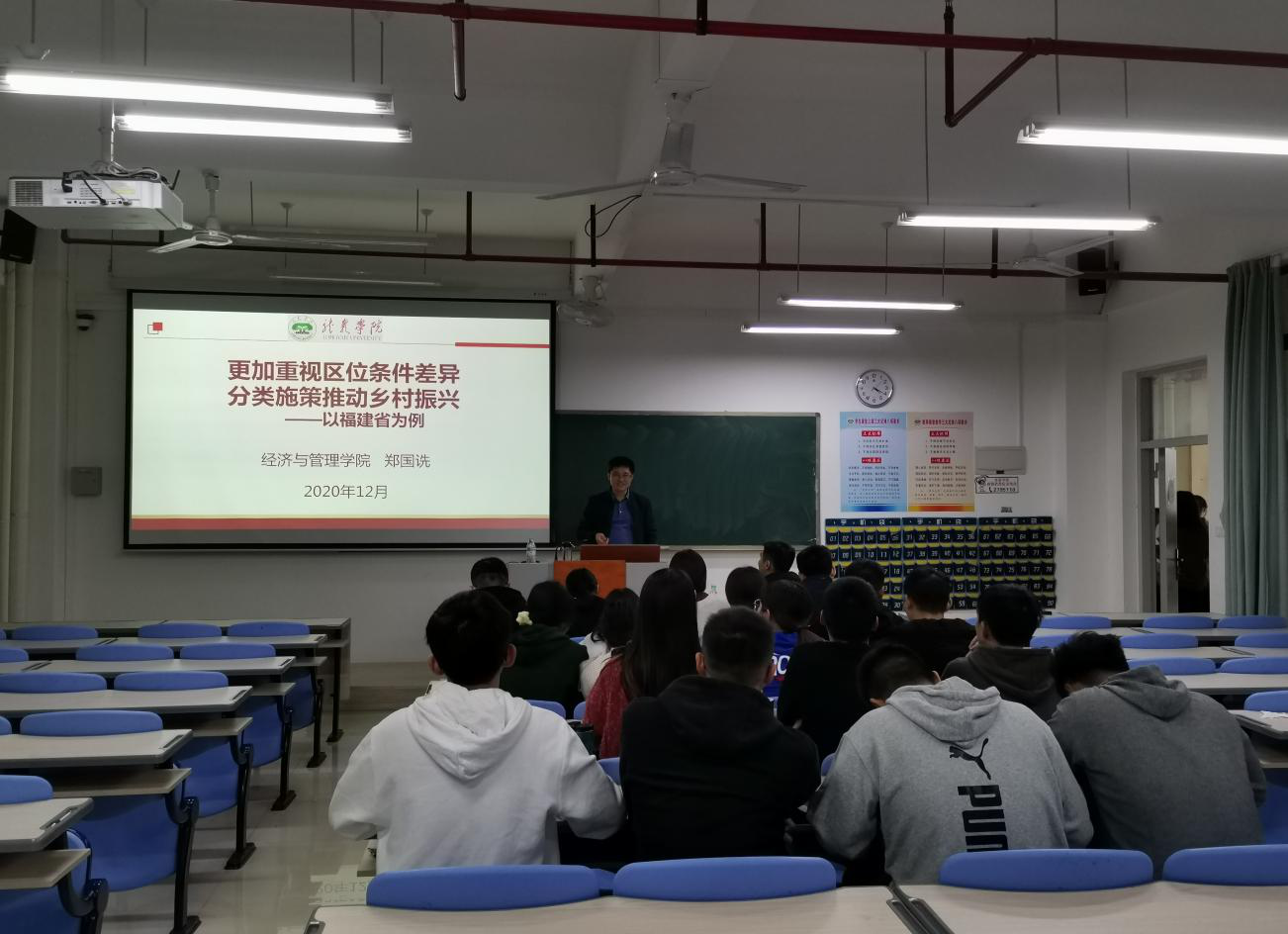 12月11日下午,经管学院学生第五党支部在厚311开展了“更加重视区位条件差异分类施策推动乡村振兴——以福建省为例”的主题党课,学生第五党支部书记谢斌老师和全体党员出席,经管学院党委委员、副院长郑国诜博士主讲。