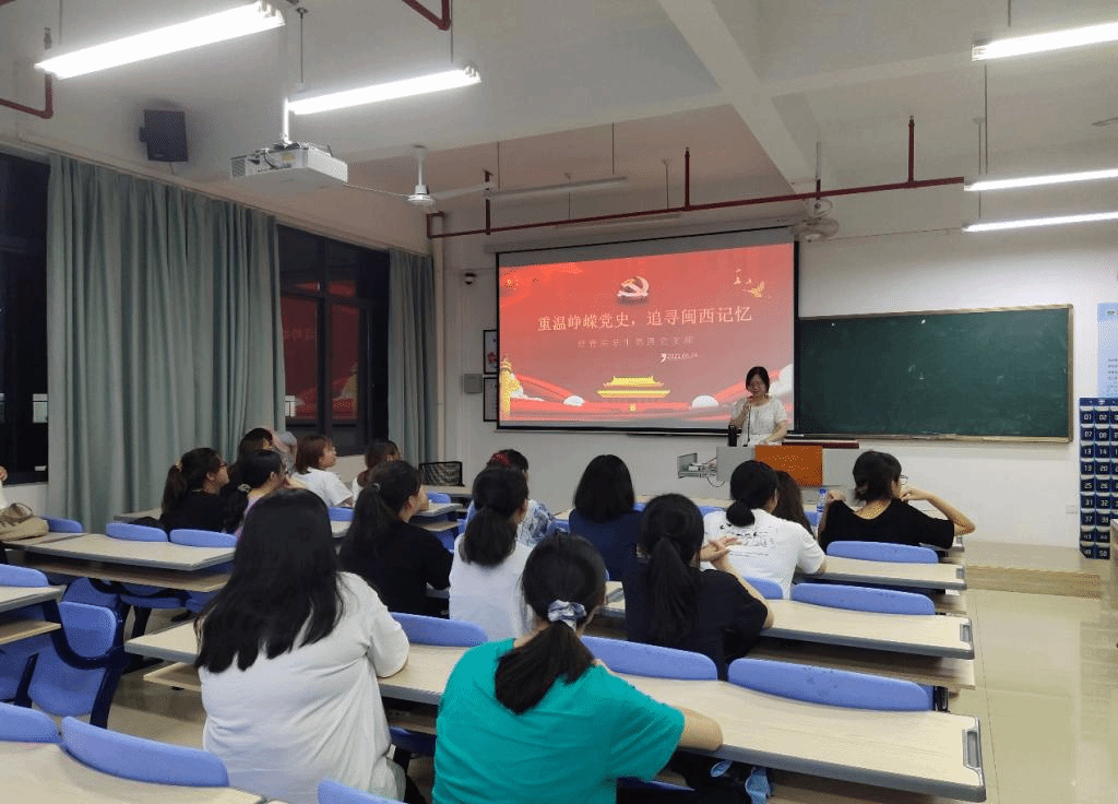 2021年6月24日,经济与管理学院学生第四党支部书记张璐滢在厚302为学生党员上党课,党课主题为“重温峥嵘党史,追寻闽西记忆”,学生第四党支部全体在校党员出席。