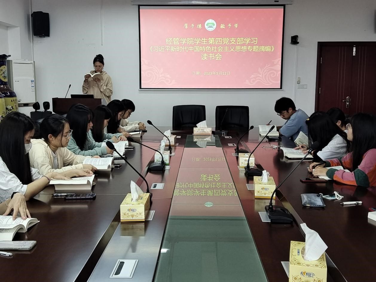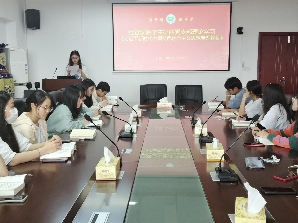 为深入全面、系统、深入学习习近平新时代中国特色社会主义思想,推动学生党员真学真懂真信真用,推动学习往深里走、往事里走、往心里走,5月12日下午,经济与管理学院学生第四党支部在厚德楼619开展主题教育集中学习——读原著《习近平新时代中国特色社会主义思想专题摘编》,本次活动由学生第四党支部书记张璐滢主持,支部全体党员参与。