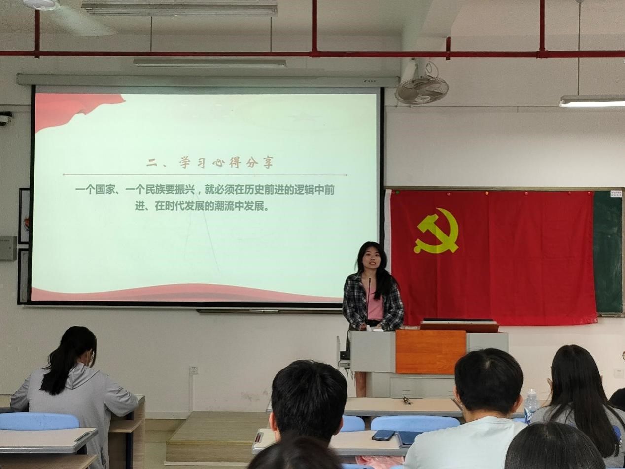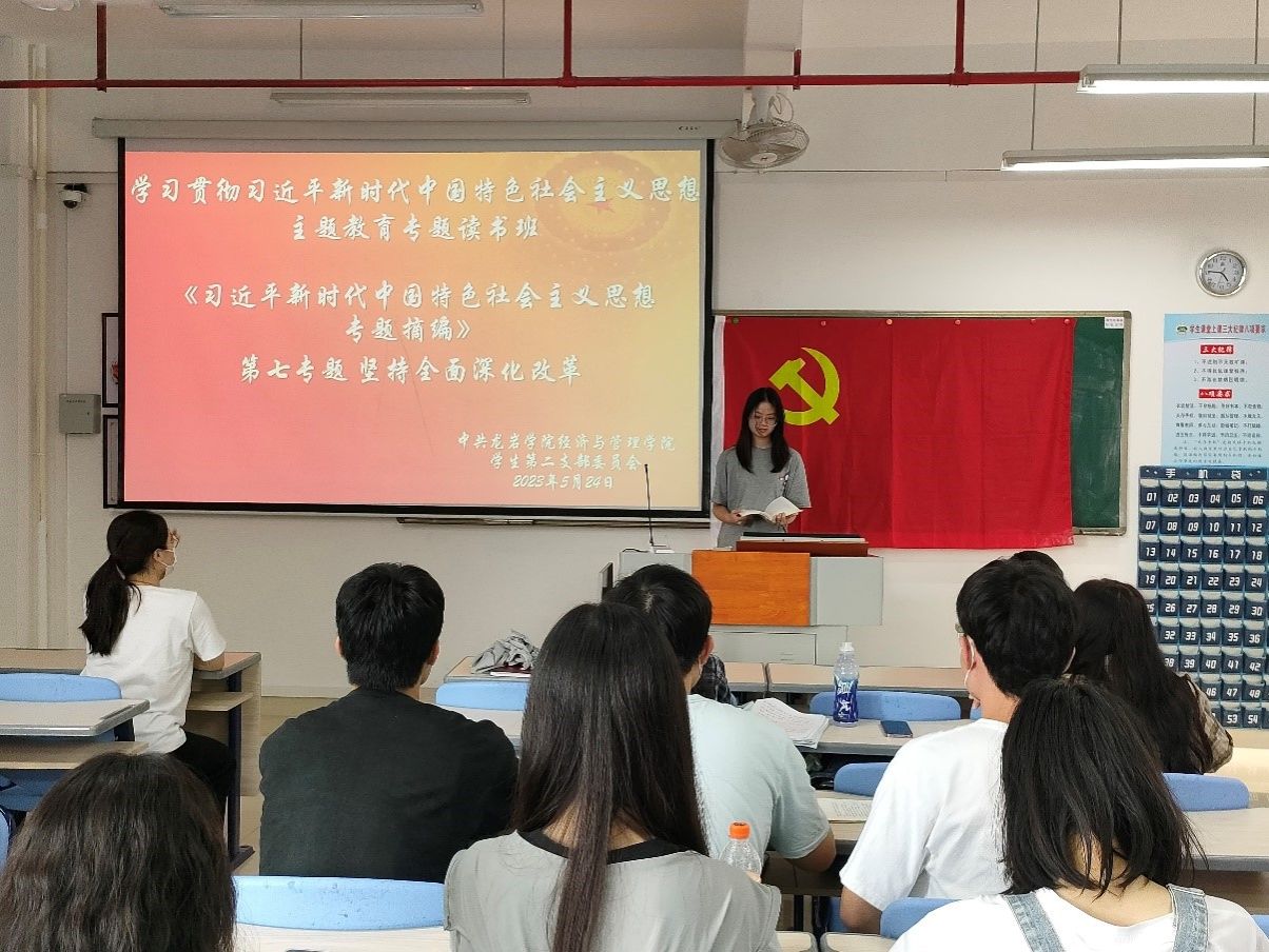 会上,学生党员程丽勋、张留康领学导读《习近平新时代中国特色社会主义思想主题摘编》的第七专题《坚持全面深化改革》。随后,苏琼莲同志分享学习心得。她表示,作为国际经济与贸易专业学生,通过对《全面深化改革》专题的深入学习,更加认识到改革开放是时代的必然选择,改革开放需要全社会的参与和共同努力。全面深化改革开放,可以不断优化经济结构,推进产业升级、技术创新、营商环境优化、国际合作增多等方面的工作,进一步加强我国在全球国际贸易中的地位和竞争力,为国贸专业青年学生走向世界提供更好的机遇和环境。
