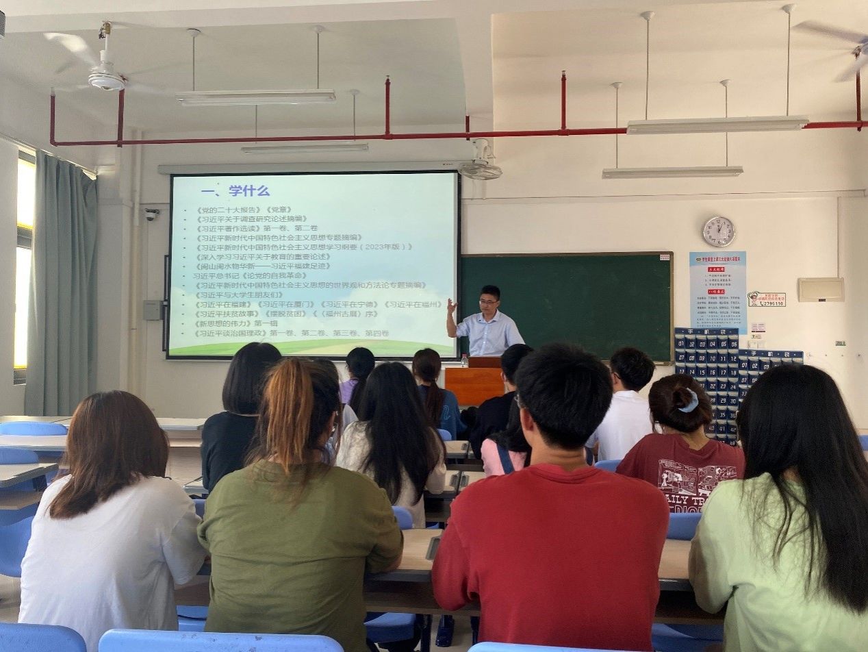 郑国诜围绕“学什么、怎么学、如何用”展开。在“学什么”方面,主要包括学《党的二十大报告》《党章》以及《习近平关于调查研究论述摘编》等原著;在“如何学”方面,以党的二十大报告为例,结合党和政府现阶段的重大方针政策以及自己的关注重点寻找关键词,然后寻找党的二十大报告涉及对应关键词的次数和相关内容,重点阅读并拓展研究;在“如何用”方面,要把自己的努力方向跟党和国家的所需相结合起来、跟课程学习和社会实践以及参与科研项目结合起来。
