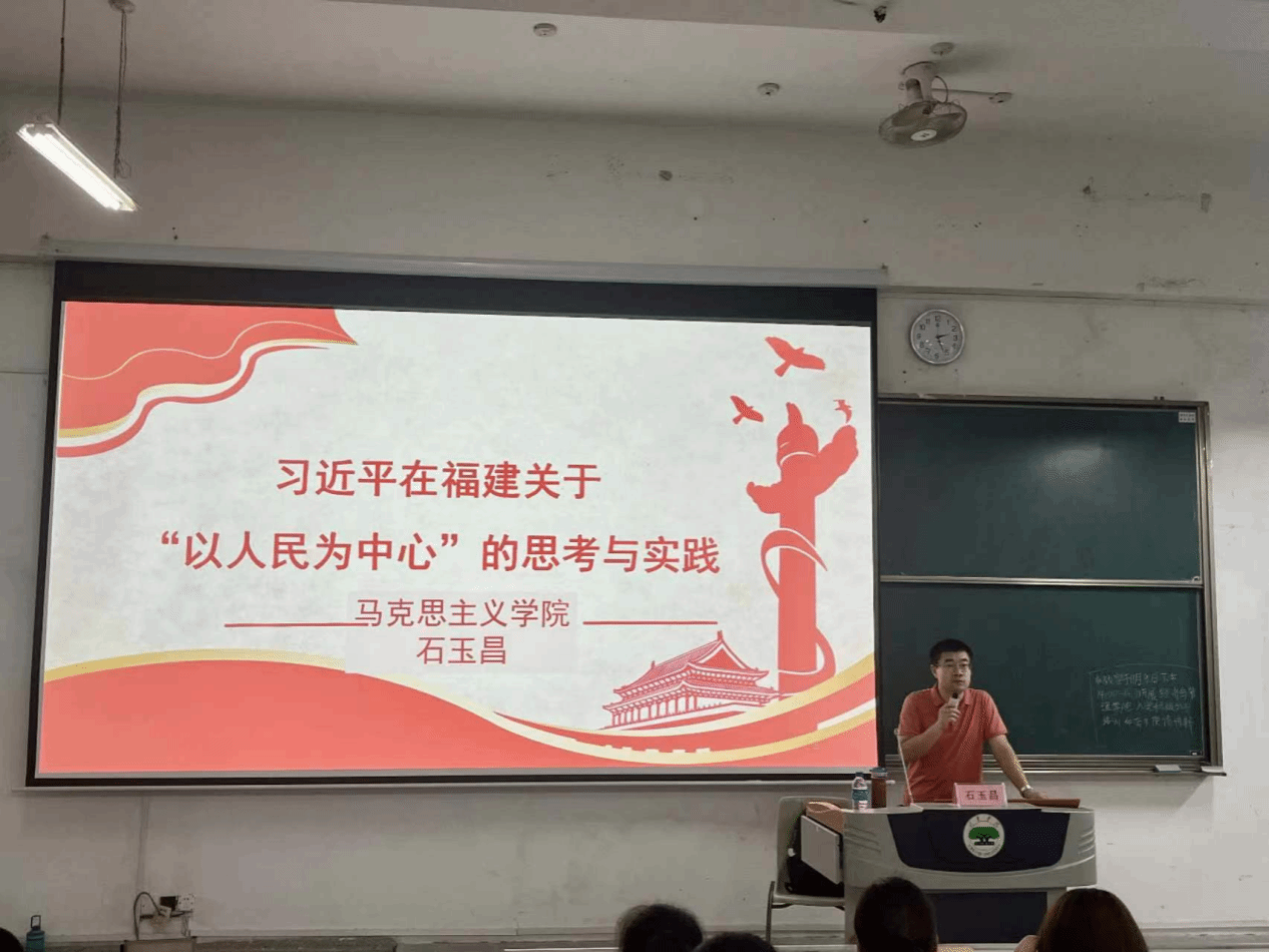 讲座中,石玉昌老师介绍了习近平总书记对福建的深厚情怀,引入讲座主题。他分别从思考、实践以及启示的三个方面展开了阐述。他强调,“以人民为中心”是党的根本立场,政府工作人员和政府机关要为人民服务、领导干部要廉洁从政、时刻关心民生福祉。