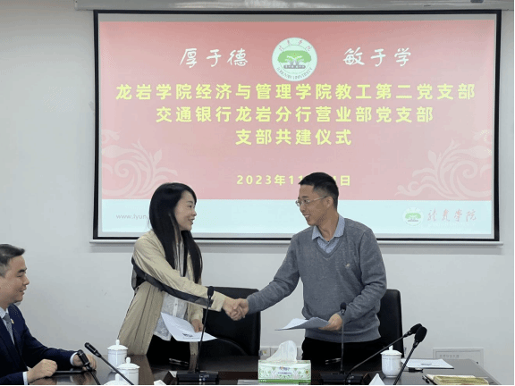 随后,赖彬玉书记介绍了交通银行龙岩分行的发展情况交通银行龙岩分行与学院在业务合作、人才培养方面都有着长久、愉快的合作。她表示,期待以支部共建为契机,将双方的合作推向新的高度。
