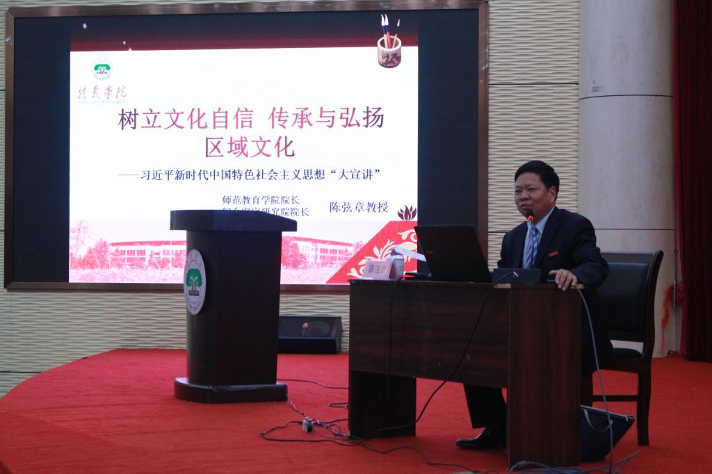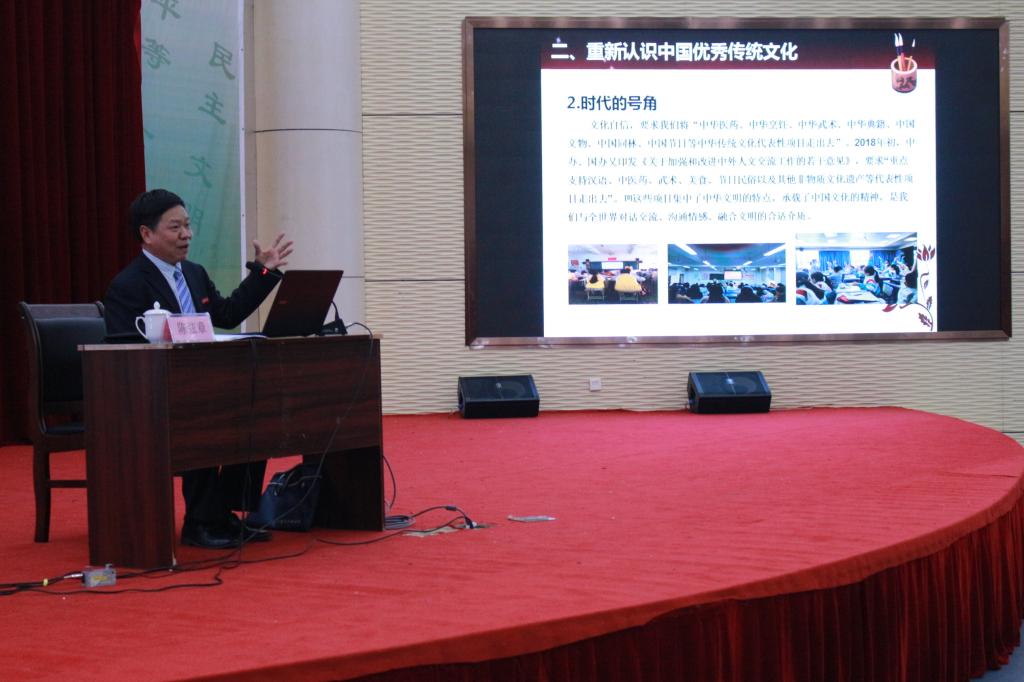 会上,陈弦章教授在新时代背景下围绕着“树立文化自信和传承与弘扬区域文化”展开宣讲。他结合中国历史、中医理论、现实事例,从“西方中心论”角度出发引出提升文化软实力的必要性;在谈到时代发展需要时,他指出要坚持中华文化独特性,不断创新;在谈到闽西客家文化时,他语言亲切、颇有感触,饶有兴致地同台下师生共同挖掘闽西客家文化背后的故事。宣讲最后,他希望广大青年师生坚持以习近平新时代中国特色社会主义思想为指引,在闽红色文化的熏陶下重视区域文化,积极做好闽西文化的保护与宣传工作,践行奋斗之路、汇聚青春之力、树立文化自信,在实现中国梦的伟大实践中实现人生出彩。