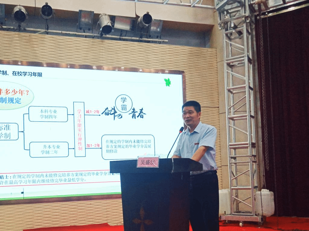 讲座上,吴盛汉从学制与在校学习年限、课程分类与学分绩点、课程考核与成绩记载等八大方面向新生细致地讲解,并结合学院往届的实际情况提出自己的看法和建议。其中,他在学业警示、考勤与请假方面着重强调,一定不能有旷课、早退、作弊等不良行为,否则会按规定采取相应的处罚措施。最后,他希望新生能在接下来的学习和生活中勤勤恳恳、积极进取,展现出绚烂的的青春风采。