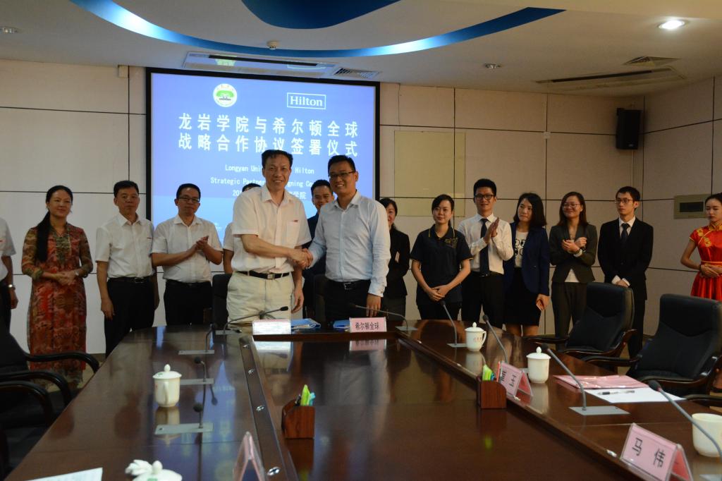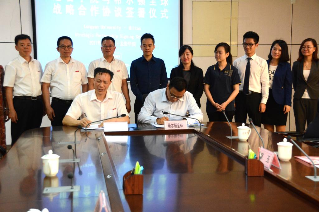 致辞结束后,双方正式签订战略合作协议,希尔顿全球向龙岩学院授校企合作铭牌,并合影留念。