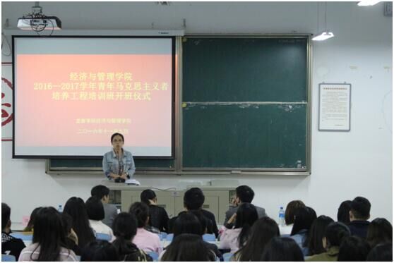 “希望同学们能够通过培训班提高思想政治素质,做优秀的青年马克思主义者,同时预祝大家顺利毕业”,11月9日下午,经管学院和艺术学院共同举办的2016-2017学年青年马克思主义者培养工程培训班在文207举行开班仪式。经管学院党委副书记郑凌燕、团委书记饶进、各年级辅导员以及“青马班”全体学员参加。仪式由团委书记饶进主持。
