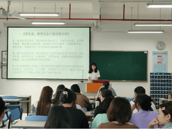 会上,学生会主席李佳雯重点强调了公约对学生干部的行为规范、职责义务和工作原则的三方面要求,提醒干部要时刻保持学生身份,并树立正确的学生会干部形象。