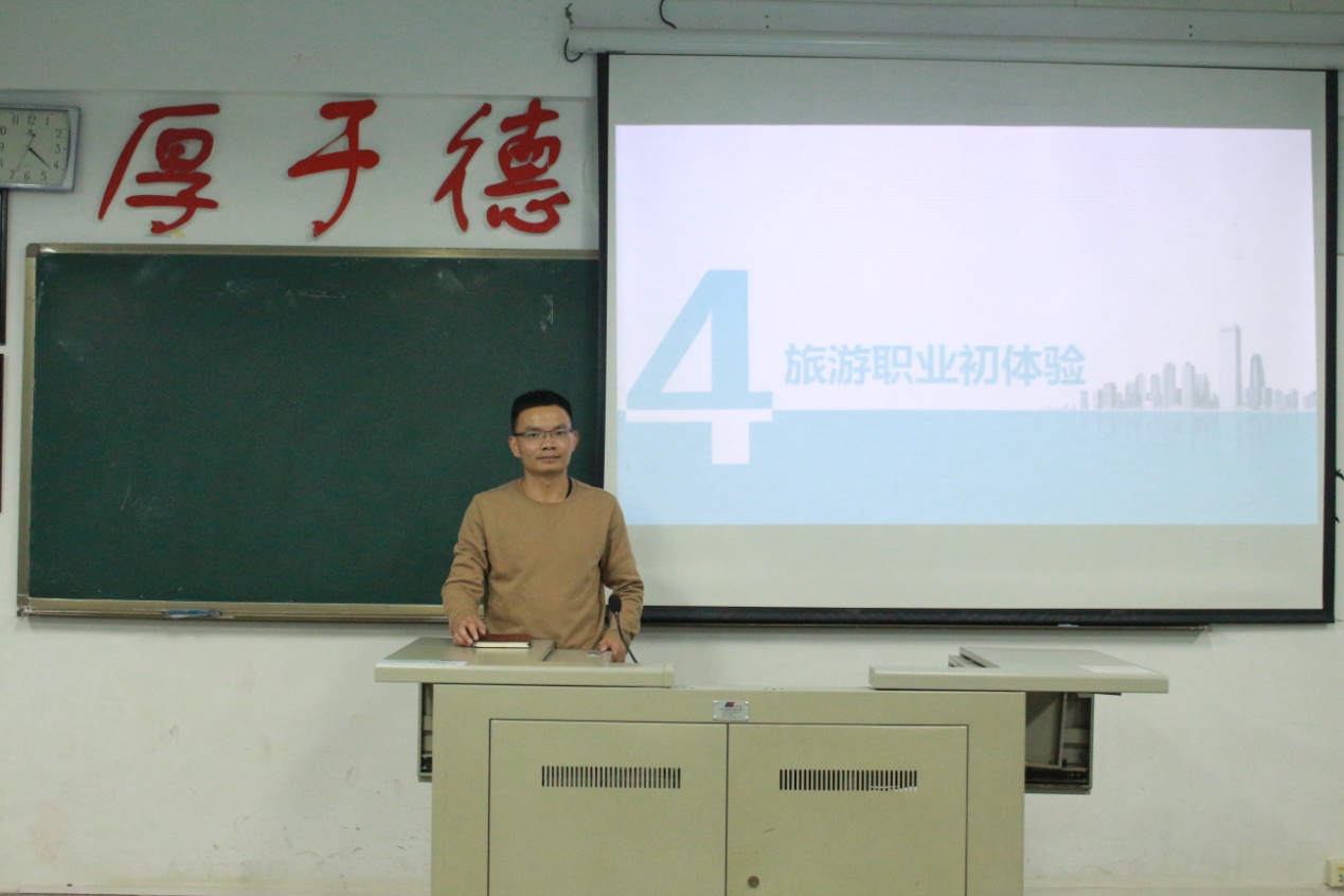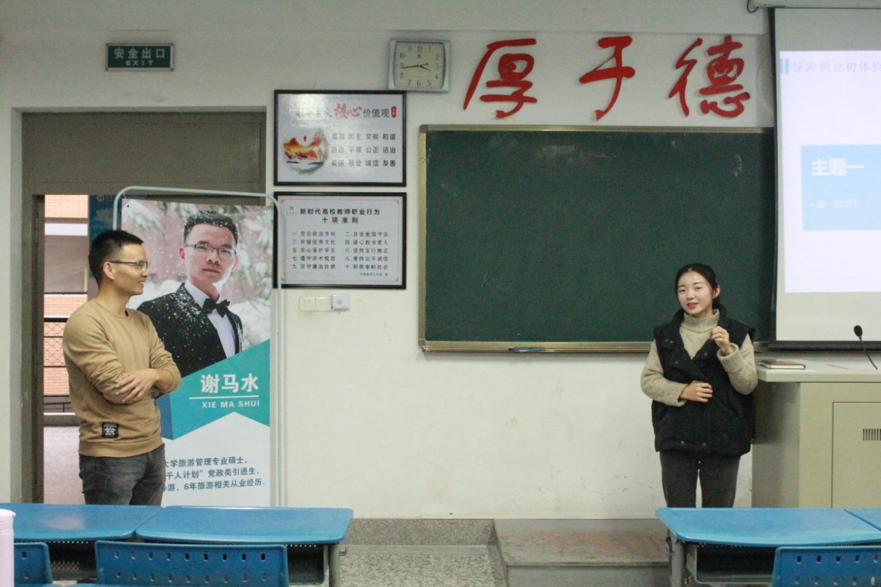 本次职业体验沙龙以“旅游收获”为主题展开,向旅游管理专业的同学们分享他6年旅游相关从业经历。首先,他从什么是旅游,为什么去旅游,怎样更好地旅游三方面分享了自己对旅游的理解,并介绍了旅游管理专业前景以及就业方向,使同学们对旅游管理专业有了更加深入的了解。而后,谢马水对旅游从业品质需求提出了独到的见解。他认为旅游从业人员需要深厚的知识储备、超强的应变能力、优秀的交际能力,同时通过旅游职业初体验环节,情境模拟的方式,让同学们对自身所具备的能力有了一定的了解。