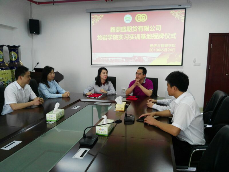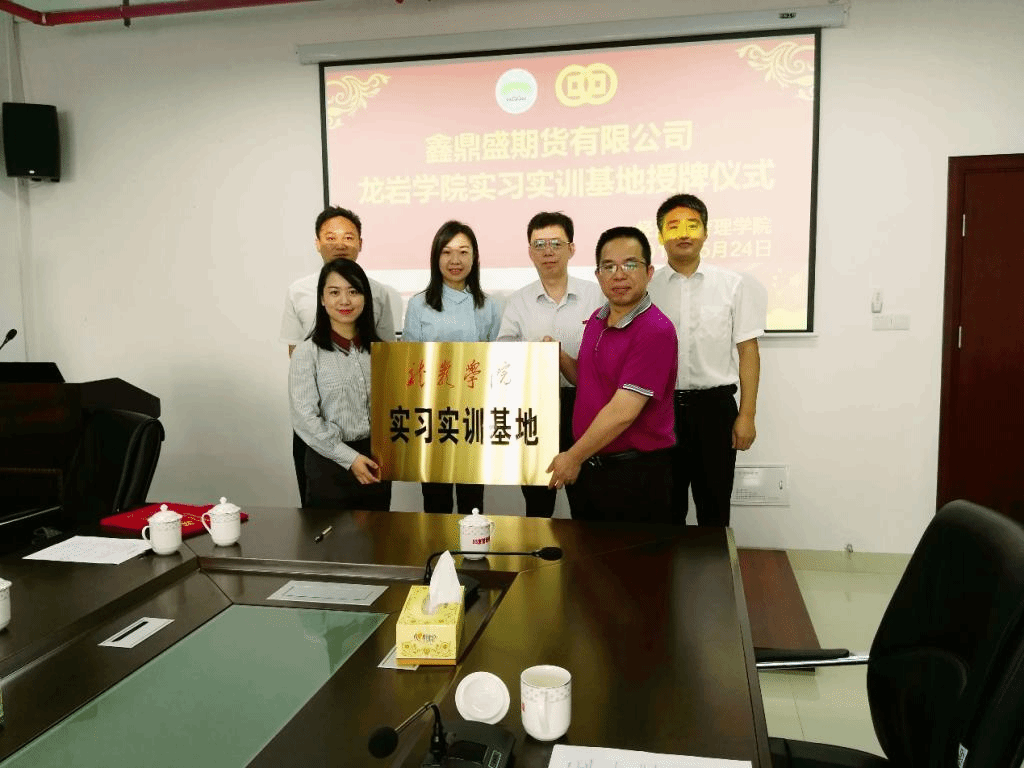 5月24日上午,经管学院举行实训基地签约和授牌仪式。鑫鼎盛期货有限公司福建省分公司总经理林夏婷、鑫鼎盛期货有限公司龙岩营业部总经理蔡伊娜,经管学院党委书记戴腾荣、院长蔡立雄、科技副院长黄可权出席实习实训基地签约和授牌仪式。
