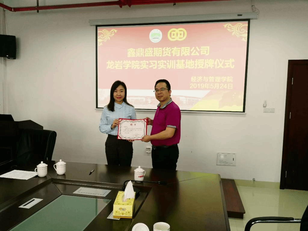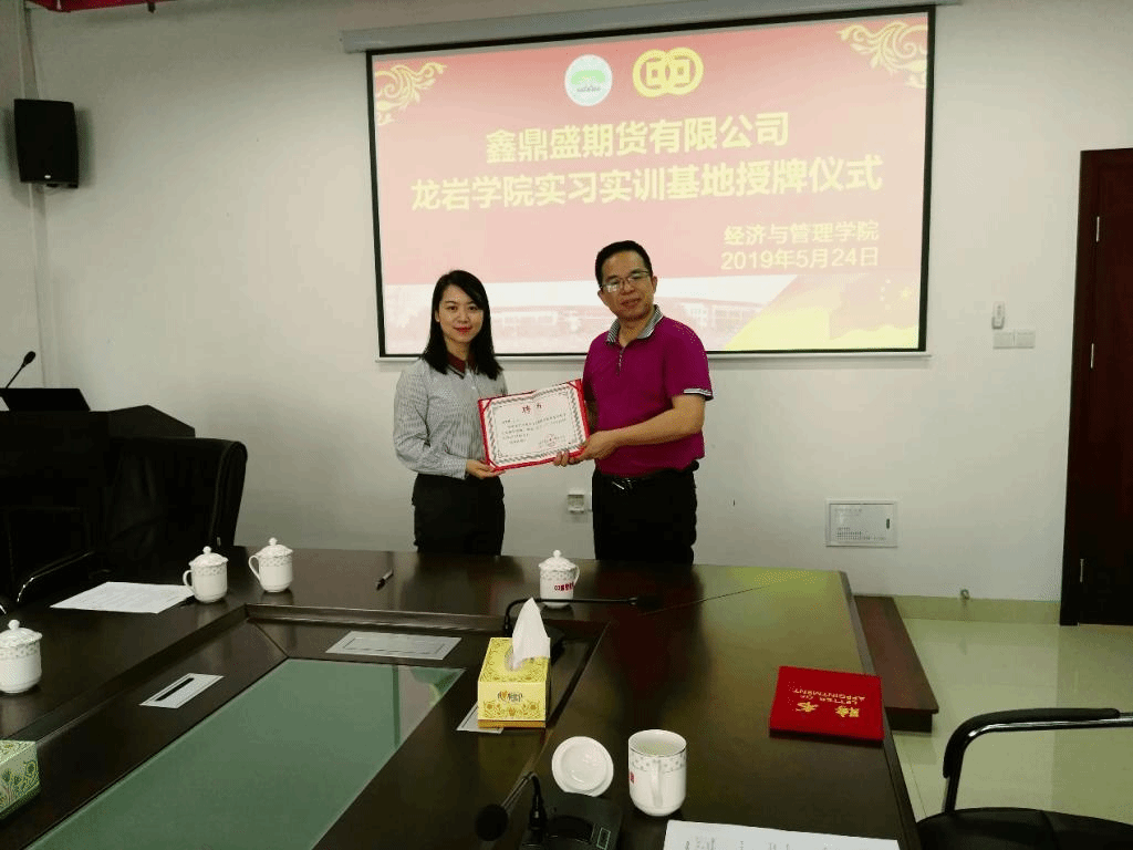 蔡立雄为鑫鼎盛期货有限公司福建省分公司和龙岩营业部颁发了实习实训基地牌匾,并向林夏婷、蔡伊娜颁发了投资学专业指导教师聘书。