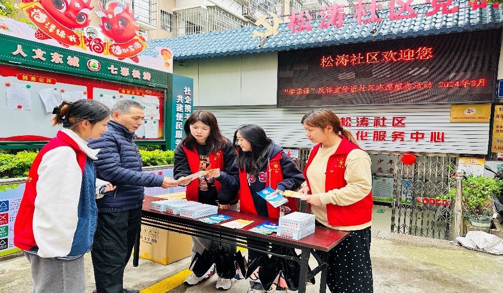 第二阶段,支部开展“学思践悟二十大,金融反诈入民心”志愿服务活动。在支部成员的带领下,班级同学共同深入龙岩市新罗区东城街道松涛社区开展金融反诈宣传活动。通过面对面讲解、集中宣讲等形式,结合已发生的诈骗案例,围绕高发的诈骗特点、常见手段、反诈对策等向社区居民讲解相关金融诈骗知识并积极引导社区居民安装“国家防诈APP”,筑牢社区反诈防线。