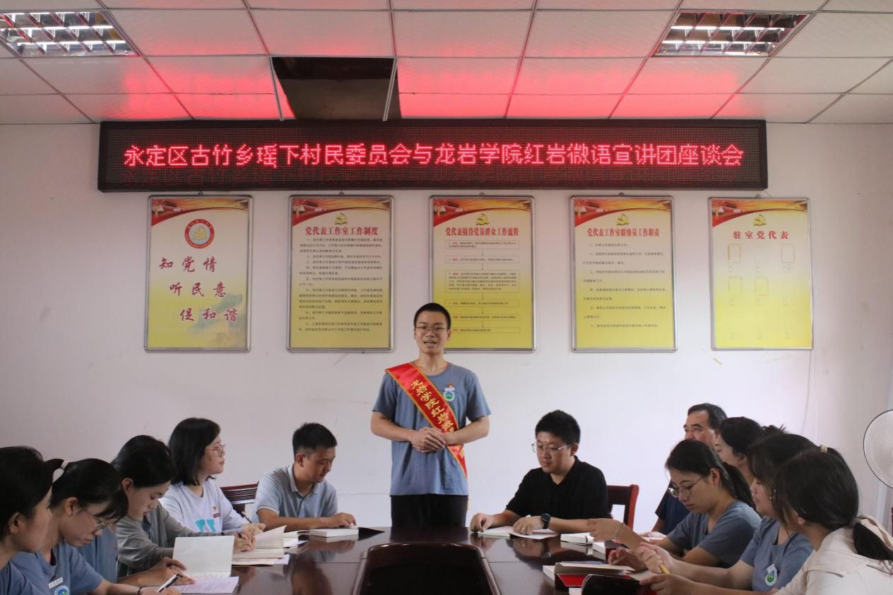 宣讲团成员与龙岩市永定区古竹乡瑶下村民委员会围绕《闽山闽水物华新——习近平福建足迹》、《习近平在福建》和《习近平与大学生朋友们》等六本书籍开展联学共建活动,永定区古竹乡党委委员、组织委员赖岚涛和永定区古竹乡瑶下村党支部书记李佳伟等乡村干部出席。宣讲团成员通过会议宣讲、交流研讨和进村入户的方式,结合读书感悟用生动的语言作“专题一:从“思源泉”看邓厝村蝶变之路”和“专题二:化“土”为金,活态保护——福建土楼申遗路”两个主题宣讲。发挥理论“亲民”的重要角色,用“身边变化”讲“理念魅力”,用“邻里家常”唠“理政新篇”,真正让习近平总书记的故事“飞入寻常百姓家”。