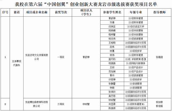 近日,第六届“中国创翼”创业创新大赛龙岩市级选拔赛在龙岩技师学院第二校区圆满落下帷幕,经济与管理学院再传捷报。经济与管理学院入驻团队申报的“龙岩迈奇文化传媒有限公司”项目(指导老师:张璐滢)在我校大学生创新创业创造基地(三创基地)中斩获主体赛现代服务赛道一等奖,奖金20000元,该项目同时获推荐征战省级选拔赛;与此同时,我院申报的“龙岩博拉森教育科技有限公司”项目(指导老师:杨加银,郭佳媛)获该赛道的三等奖,奖金10000元。