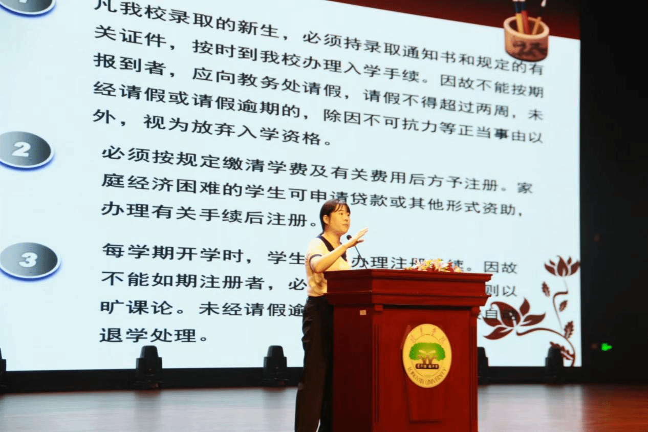 学籍管理环节,院长助理陈岚为新生细致讲解学籍定义、注册流程、异动情况以及课程学分设立规则等,为同学们们提供了全面、系统的学籍知识,为他们在大学期间顺利完成学业、进行学业规划奠定了坚实基础。