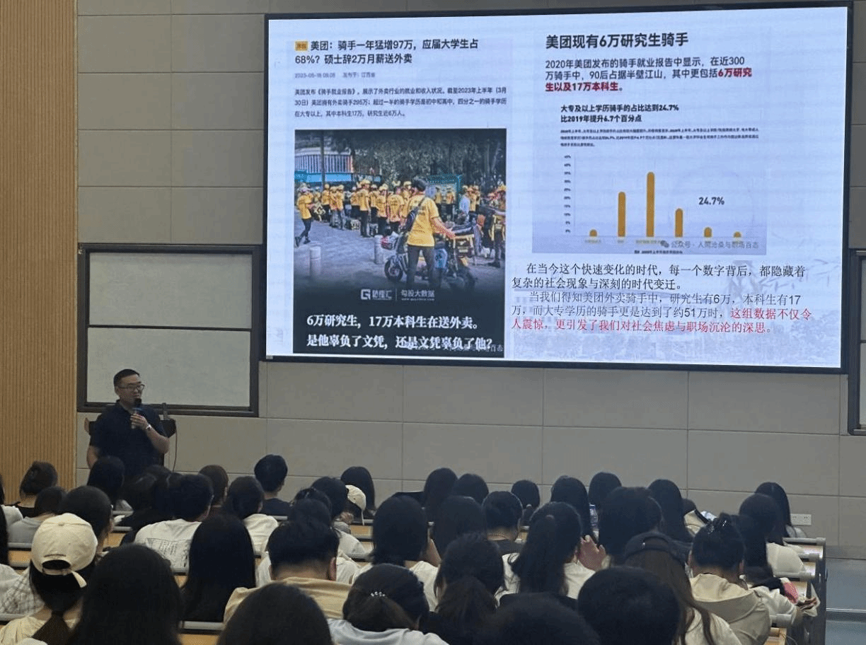 活动中,郭明净从就业形势与政策、求职现状分析和求职前信息搜集等三个方面为学生们带来了精彩的分享。用直观明了的数据,从社会众多现象与各个渠道讯息深入分析了当前就业市场的形势和升学趋势。同时强调了当前就业形势的严峻,为学生们提供了宝贵的就业建议和指导。交流环节中,郭明净就求职技巧和未来就业规划等问题给予了耐心细致的解答,学生们表示收获颇丰。