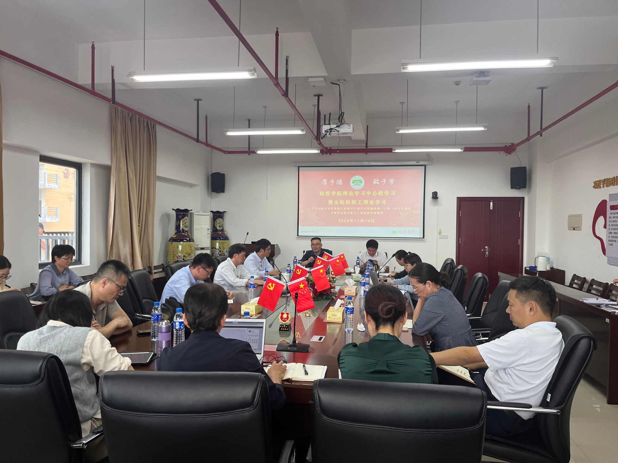 11月14日下午,经管学院在厚德楼619会议室召开理论学习中心组学习暨全院教职工理论学习会,深入学习习近平在省部级主要领导干部学习贯彻党的二十届三中全会精神专题研讨班开班式上的重要讲话精神。本次学习会由经管学院党委书记卢永衡主持,全院教职工参加。