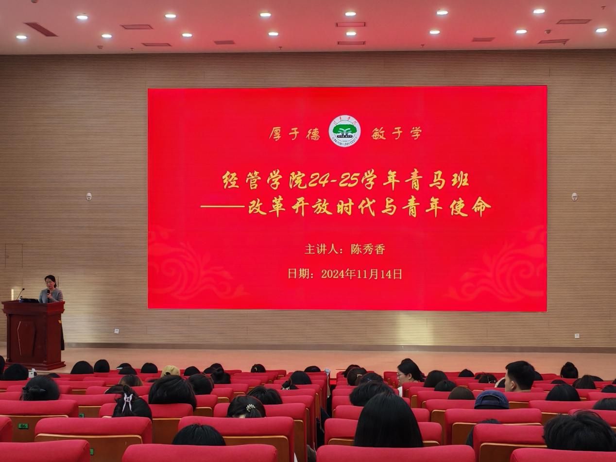 11月14日,经管学院于学生活动中心三号报告厅开展经济与管理学院第四期青马班暨新发展团员培训班主题讲座。本次讲座以“改革开放时代与青年使命”为主题,讲座由马克思主义学院陈秀香老师主讲,全体青马班同学、新发展团员参加。