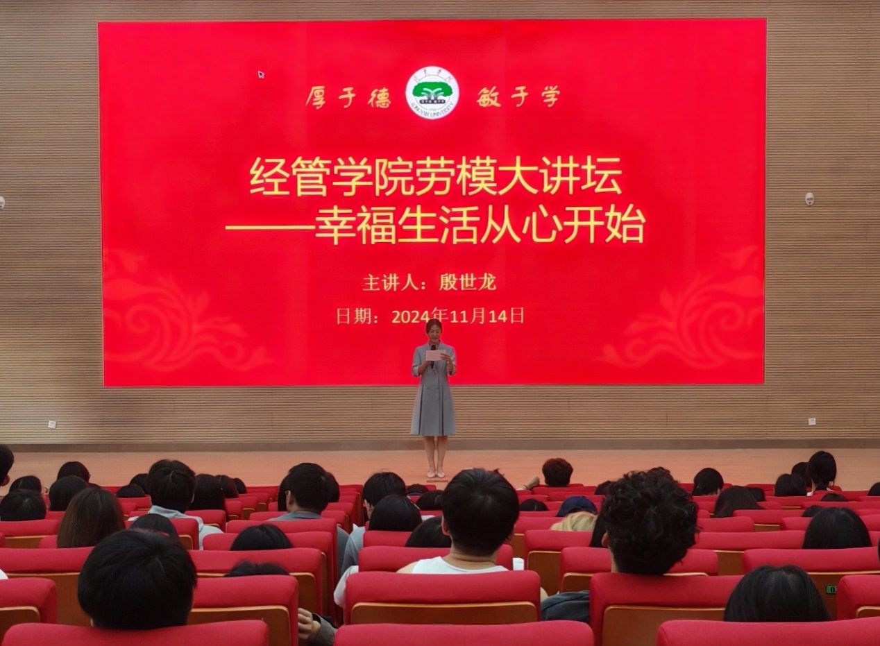 11月14日下午,经管学院于沁华楼3号学术厅举办劳模工匠进校园专题讲座,全国五一劳动奖章获得者殷世龙以“幸福生活从心开始”为主题展开演讲,经管学院心保委员、学生代表等共200余人聆听讲座。
