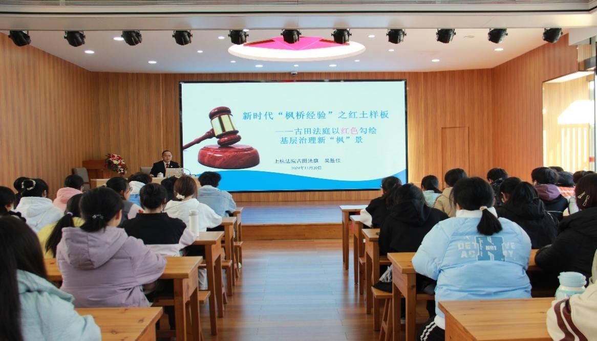 第一站,成员们来到上杭县古田人民法庭,参加由吴胜佳法官主讲的《新时代“枫桥经验”之红土样板》专题讲座。吴胜佳法官结合自身工作实际讲述“枫桥经验”在乡镇的灵活应用,并强调了在新时代科技背景之下,坚持党的全面领导、加强法治教育、推动中国特色社会主义法治建设是每一位党员同志义不容辞的责任。吴胜佳法官为大家答疑解惑,这也更加坚定了党员同志为健全共建共治共享的社会治理制度奉献青春力量的决心和信念。