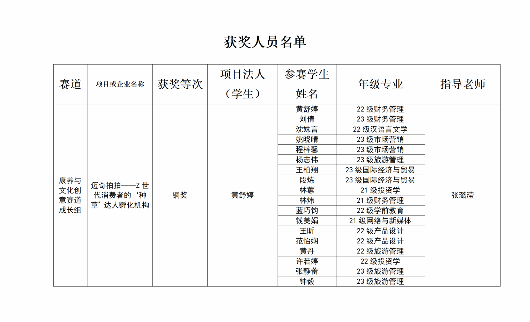 近日,2024年度海峡两岸女大学生创新创业大赛在厦门国贸高新人力资源服务产业园圆满落幕。我院创新创业团队申报的“迈奇拍拍——Z世代消费者的‘种草’达人孵化机构”项目(指导老师:张璐滢)斩获本次比赛康养与文化创意赛道成长组铜奖。
