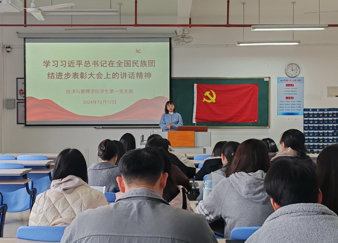 12月12日下午,经济与管理学院学生第一党支部在厚德楼403开展“学习习近平总书记在全国民族团结进步表彰大会上重要讲话精神”的主题党日活动。会上,支部书记郑梦妮带领全体党员学习习近平总书记在全国民族团结进步表彰大会上的重要讲话精神,要求支部全体党员深入学习贯彻习近平总书记在全国民族团结进步表彰大会上的重要讲话精神,深刻领会核心要义,将思想和行动高度统一到党中央关于民族团结的重要决策部署上来。党员们认真聆听,踊跃发言畅谈感想。支部副书记林炜谈到,“我们宿舍旁边的福籽广场上就有石榴籽主题雕塑、民族团结灯杆旗,这些都生动体现了铸牢中华民族共同体意识,提醒着我们青年大学生要牢记习近平总书记的殷殷嘱托,共同画好民族团结同心圆。”