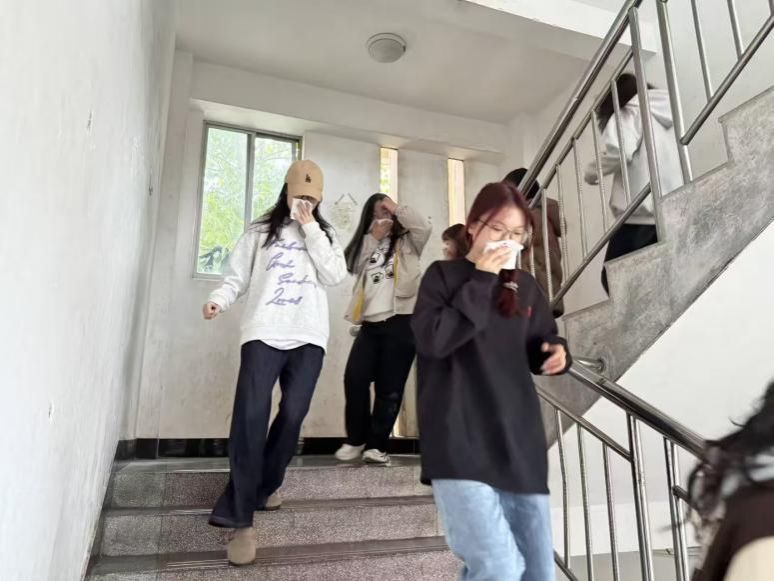 应急演练内容涵盖了模拟火灾报警器、投放烟雾弹、引导学生安全疏散等多个关键环节。演练开始前,由卢滨胜向演练学生解读疏散演练方案,强调安全事项。警报声响起后,演练正式开始。各小组按照预定的应急预案有条不紊地展开行动。疏散引导组引导参演学生用湿毛巾捂住口鼻,低姿前行,快速、有序地撤离到安全区域。