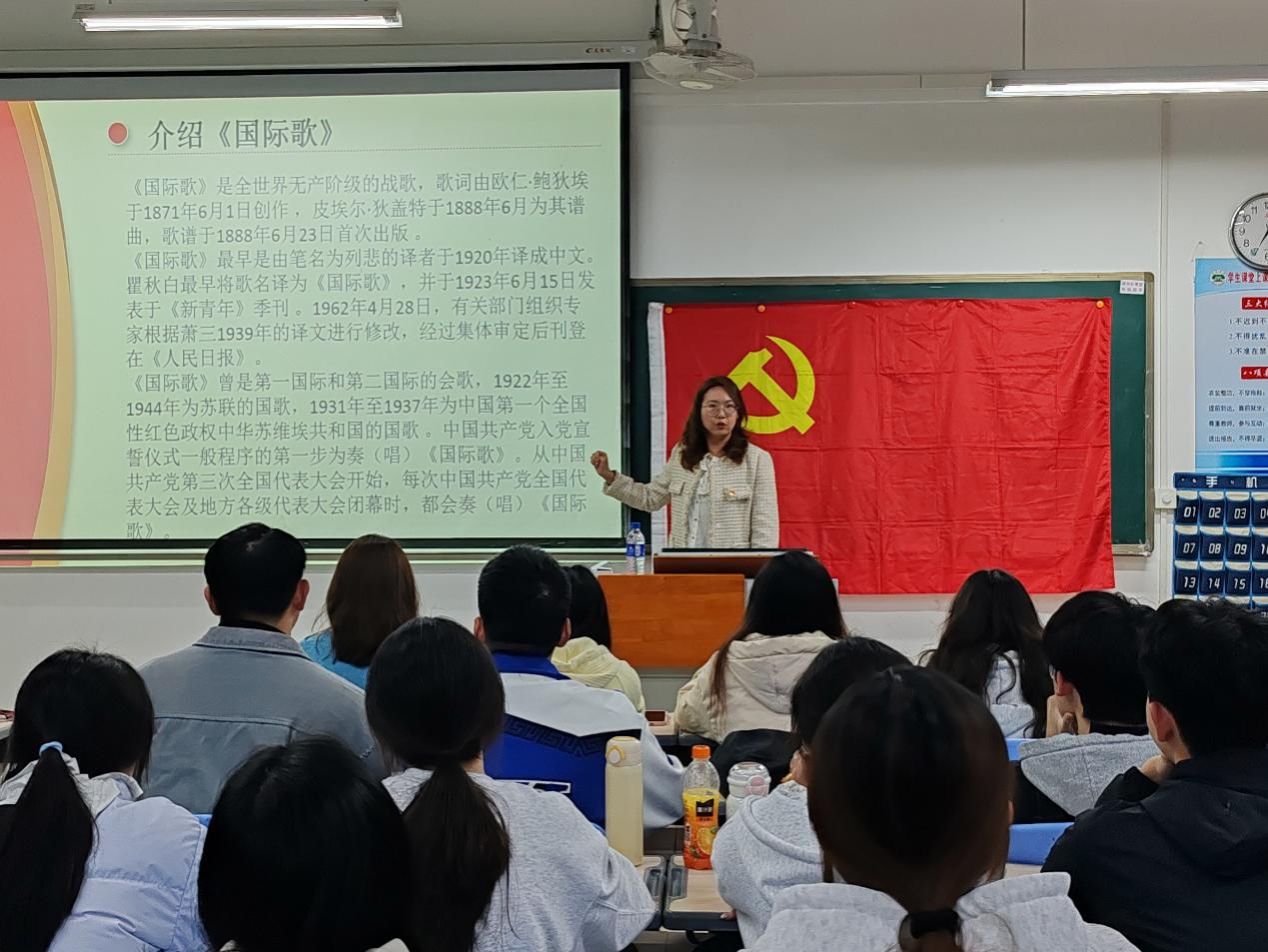 《国际歌》是全世界无产阶级的战歌,是入党宣誓仪式一般程序的第一步。活动中,孔德芳老师讲述了《国际歌》的创作背景和历史影响,用抑扬顿挫的声调和语调,使得同学们了解《国际歌》的旋律、歌词及基本节奏。讲解过程中,将国际歌与同学们的日常学习生活深入结合,用国际歌的歌词鼓舞大家,要有自我革命的精神。全体成员们认真学习,积极与老师互动。在讲座最后,全体同志共同用激情澎湃的声音正确演唱《国际歌》。