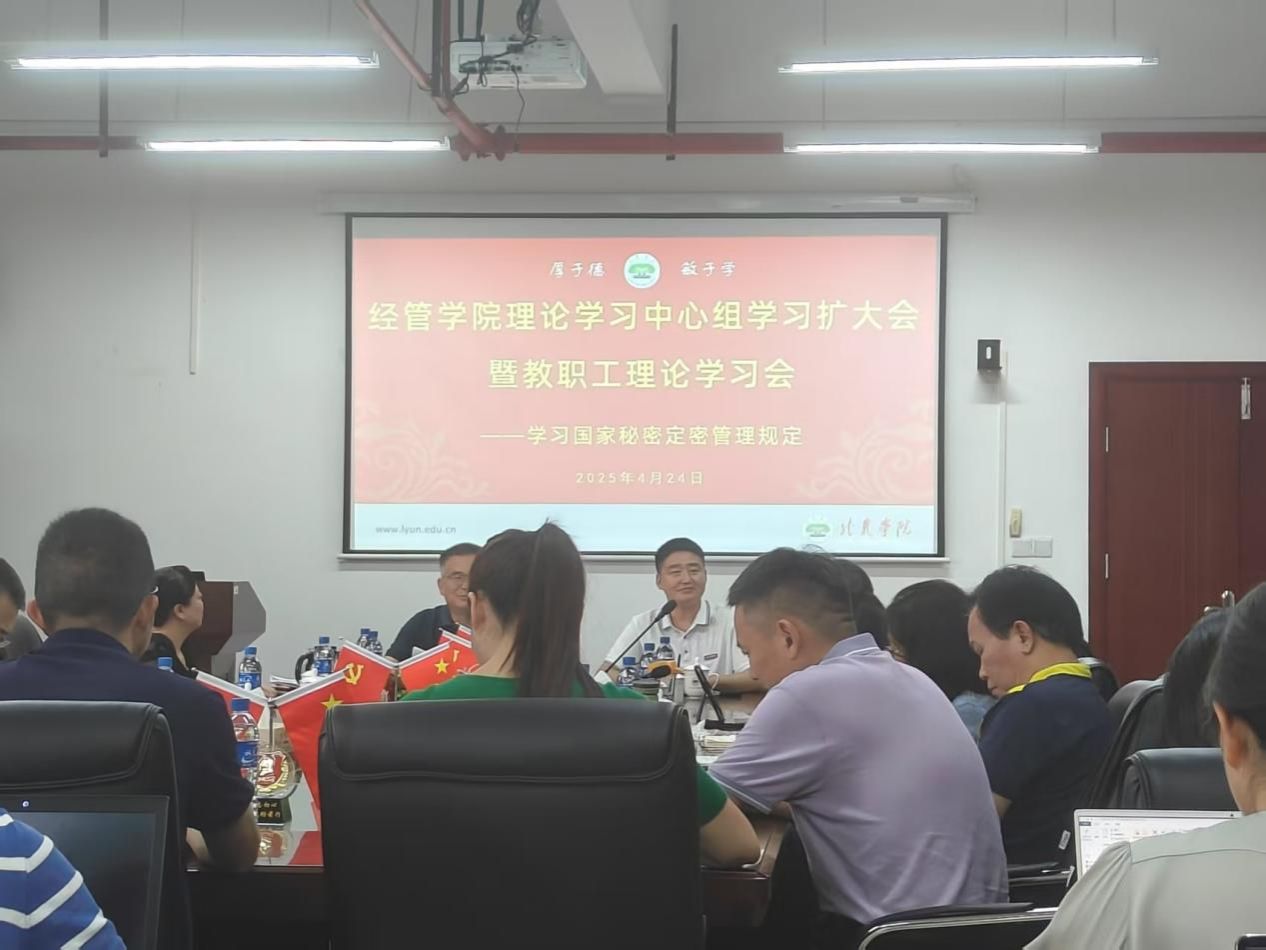 4月24日下午,经济与管理学院在厚德楼619会议室举行理论学习中心组学习扩大会暨教职工理论学习会,深入学习国家秘密定密管理规定。本次理论学习会由院党委书记卢永衡主持,全院教职工参加。