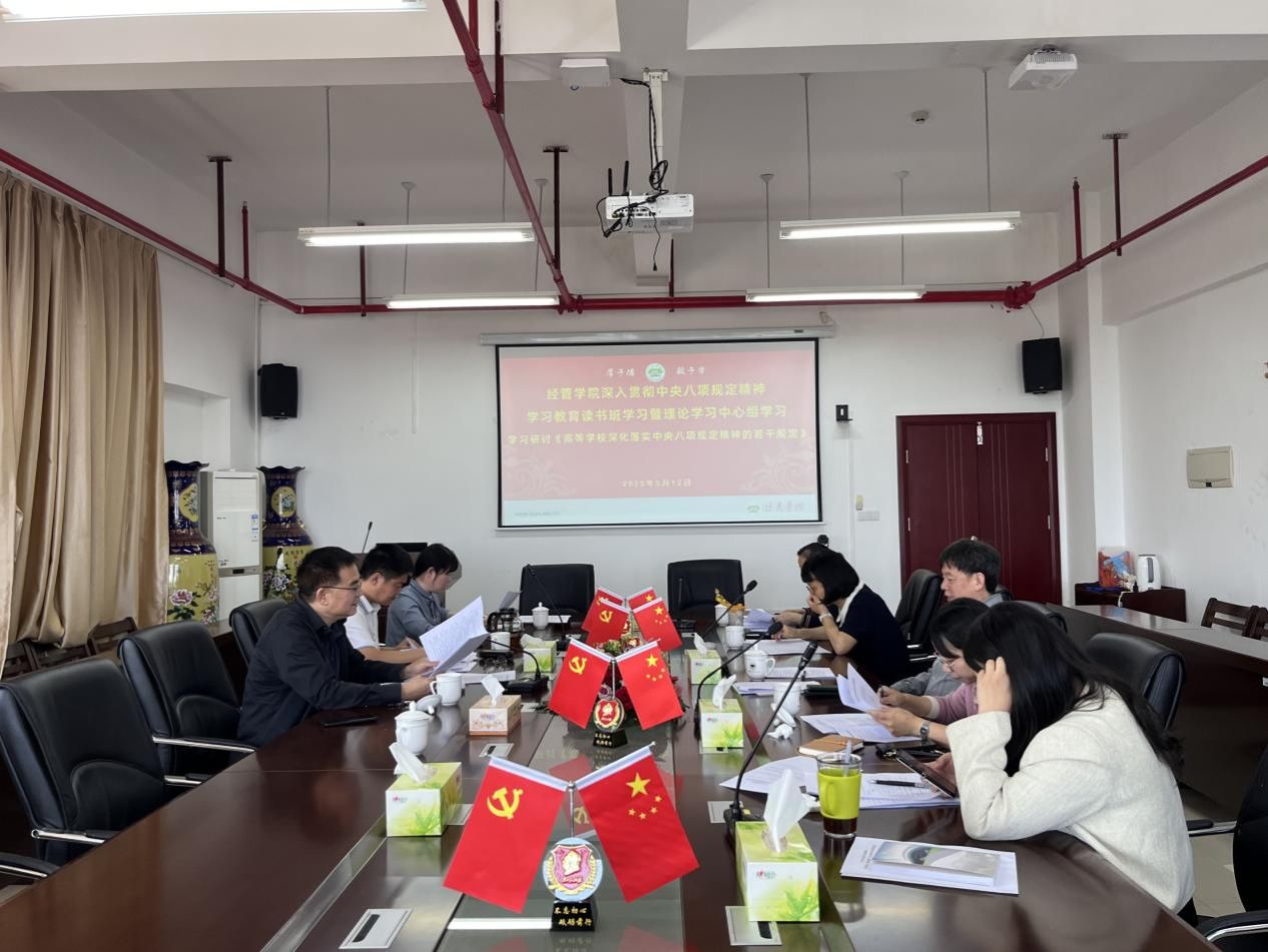 5月12日上午,经济与管理学院党委在厚德楼619会议室举行深入贯彻中央八项规定精神学习教育读书班学习暨理论学习中心组学习,学习研讨《高等学校深化落实中央八项规定精神的若干规定》。经管学院深入贯彻中央八项规定精神学习教育读书班全体成员参会。