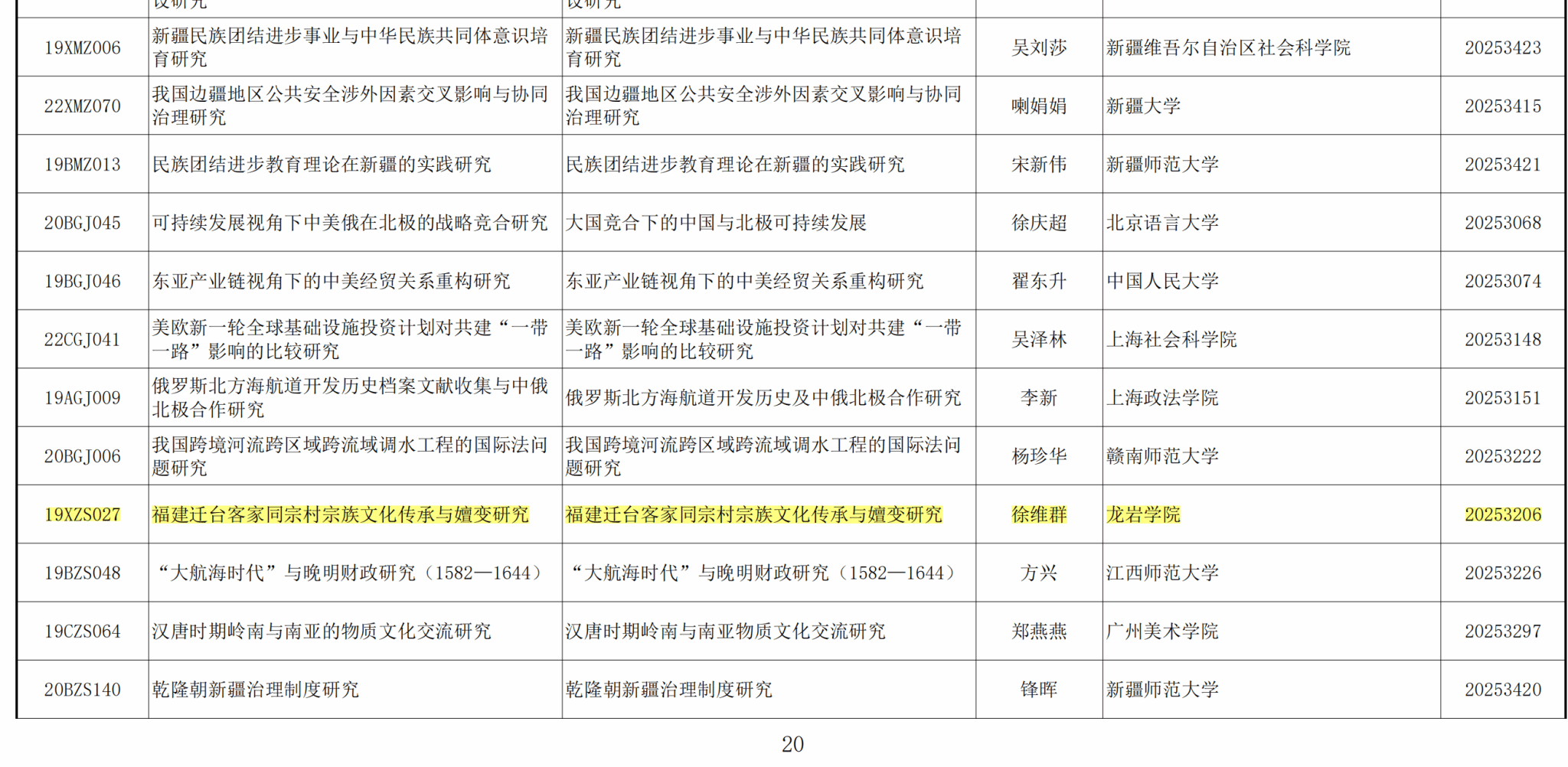 日前,全国哲学社会科学工作办公室公布了2025年9月国家社科基金年度项目结项情况,我院徐维群教授主持完成的2019年度国家社科基金项目“福建迁台客家同宗村客家文化宗族文化关系传承与嬗变研究”获准结项,这标志着在闽台客家历史与客家宗族研究领域取得重要的新成果。