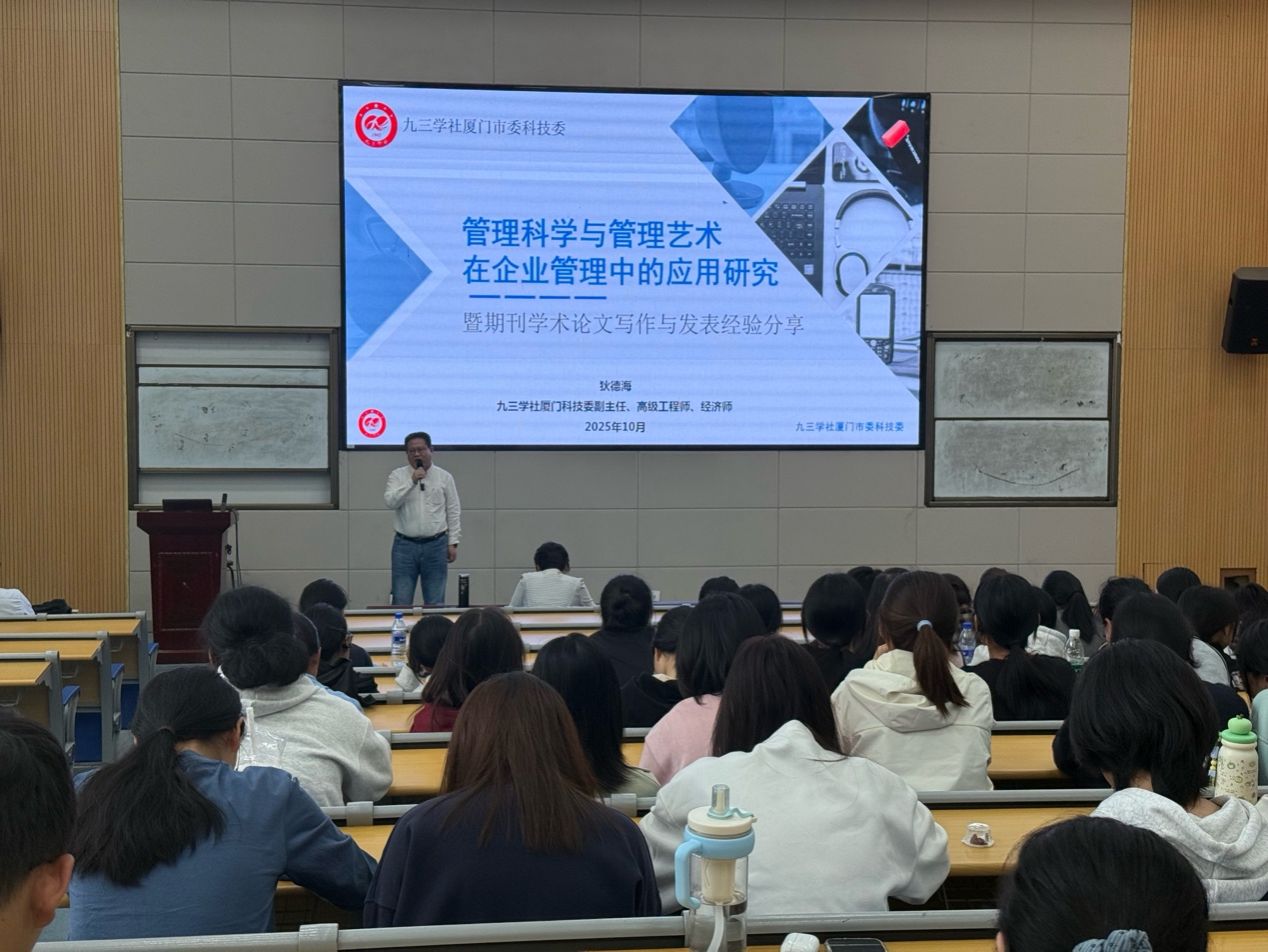 厦门市摩尔环宇通信技术有限公司董事长狄德海,围绕《管理科学与管理艺术在企业管理中的应用研究-暨期刊学术论文写作与发表经验分享》展开讲解。他既结合企业管理实践,解析了管理科学与艺术的落地应用技巧,又毫无保留地分享了期刊论文选题、构思、撰写及投稿的实用经验,为师生学术研究与成果转化提供了宝贵参考。