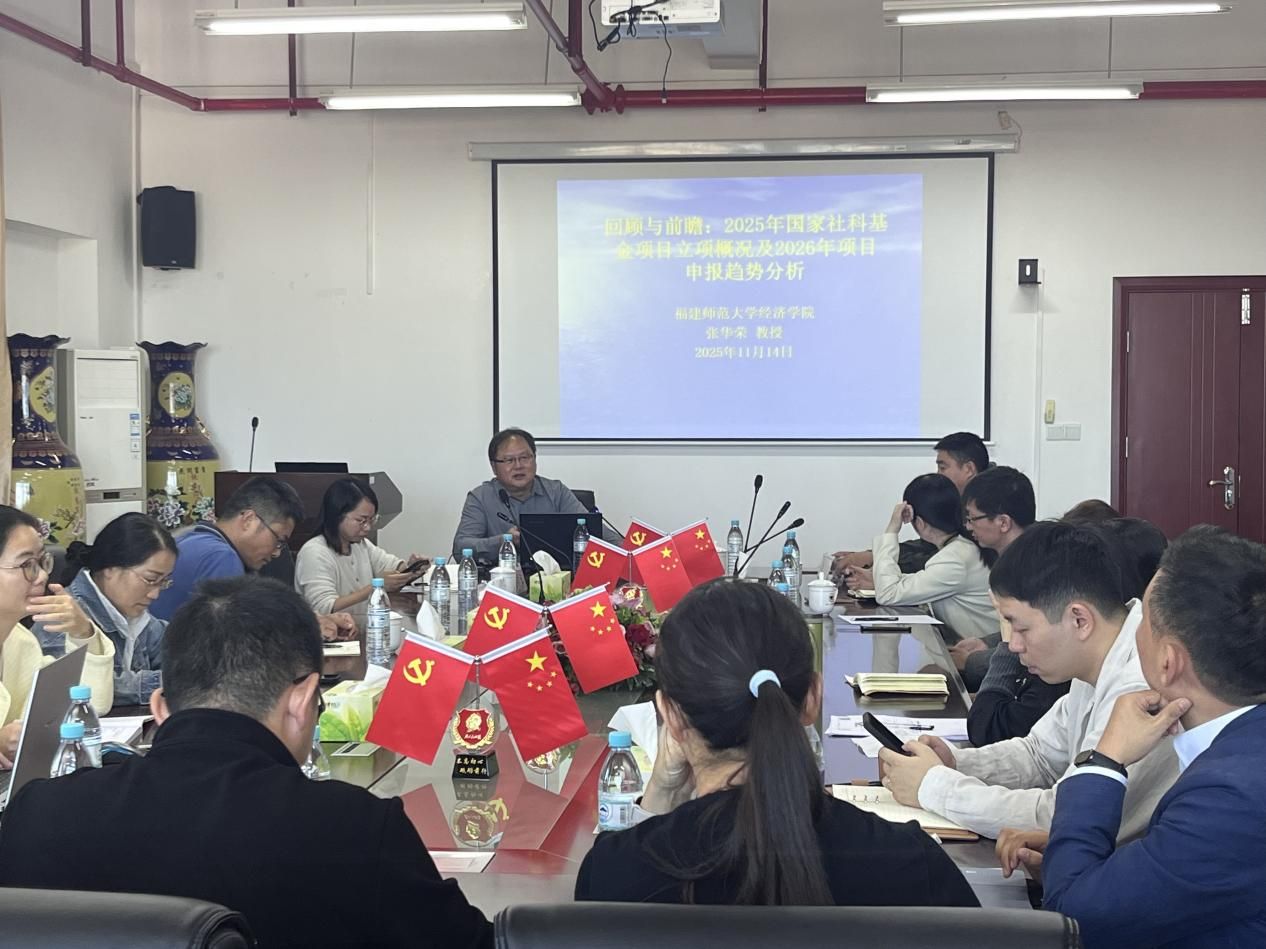 11月14日,福建师范大学经济学院张华荣教授受邀莅临我院,开展“2025年国家社科基金项目立项概况及2026年申报趋势分析”专题讲座。院长黄可权及全体专任教师参加活动并进行互动交流,副院长庄彩云主持会议。
