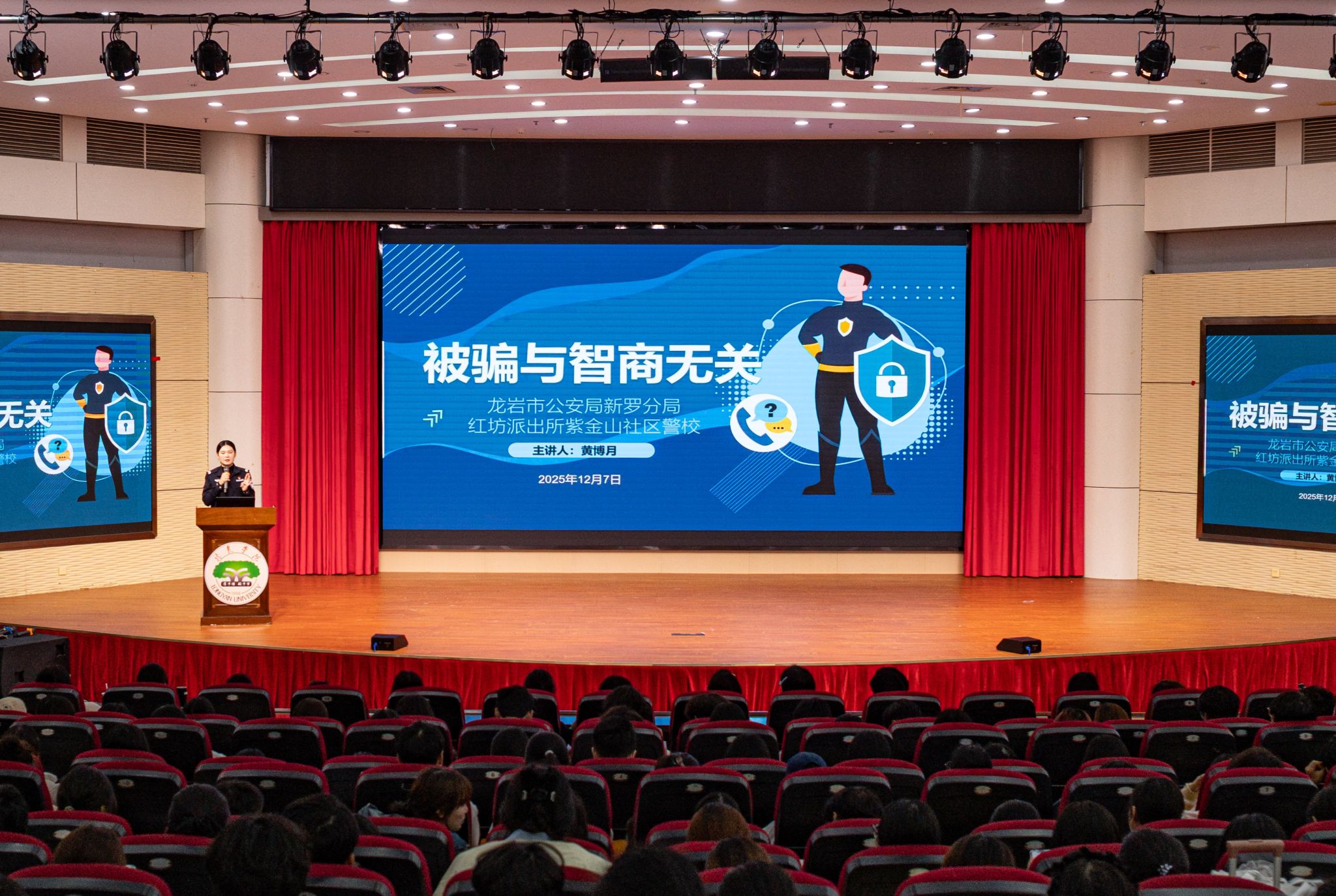 为增强2025级新生的安全防范意识,共同维护校园平安稳定,12月7日晚,经济与管理学院开展了一场涵盖反诈、禁毒、交通安全的专题教育讲座。本次讲座特别邀请了龙岩市公安局新罗分局红坊派出所民警黄博月主讲,吸引了2025级全体新生积极参加。