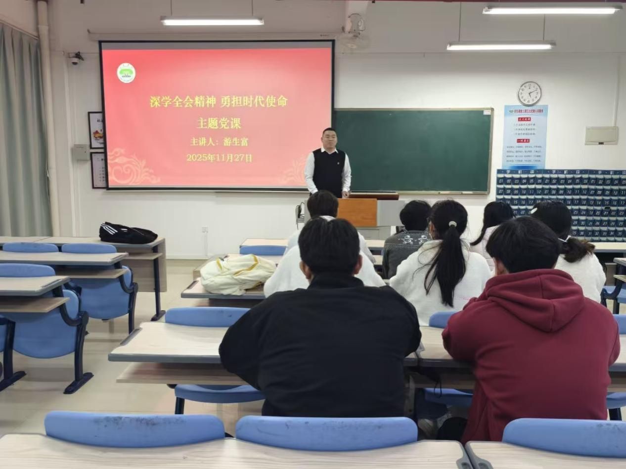 游生富围绕“深刻把握党的二十届四中全会的重大意义与实践要求”展开详细讲解,从时代背景、“十四五”时期我国发展取得的历史性成就,到“十五五”时期经济社会发展的指导思想、重大原则和核心任务,进行了系统深入的剖析,着重解读了“建设现代化产业体系”“统筹教育强国、科技强国、人才强国建设”等与青年学生成长紧密相关的内容,深入分析了新时代青年党员在强国建设征程中肩负的责任与使命。
