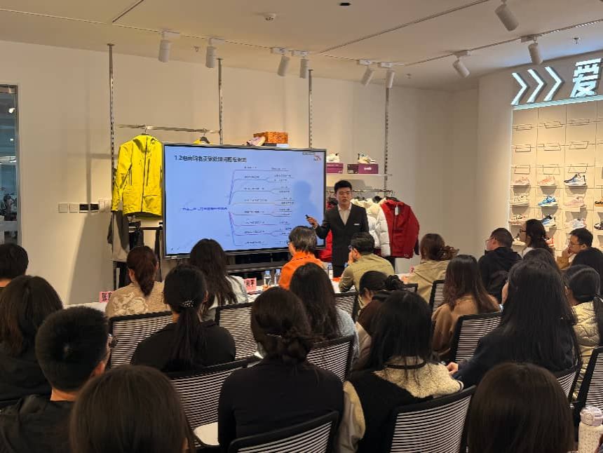 黄伟滨副总监作实训总结汇报,他介绍了安踏与龙岩学院校企协同育人的全周期管理机制,从开班明确岗位职责,到中期评估优化实习方案,再到结业闭环培养,形成“做中学、学中悟”的培养体系。他肯定了学生在实训期间的优秀表现,提到23级学生深入参与电商运营、市场调研、品牌推广等核心岗位,在“双11大促”中提出的创新营销建议获企业认可,展现出良好的职业素养与学习能力。
