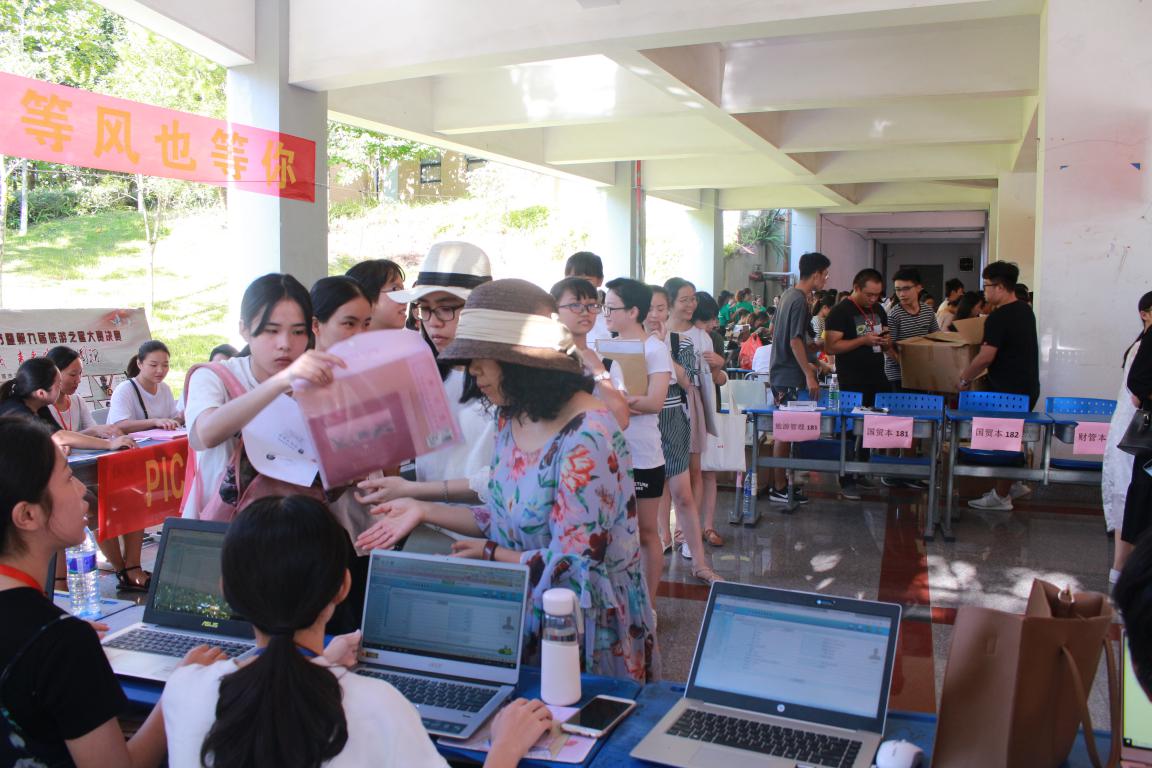 早在几日前,经管学院在戴腾荣书记,蔡立雄院长,郑国诜副院长,辅导员翁佳妮、谢斌的带领下就着手布置迎新活动。此次迎新,按以往实例,每位新生都有专门对接学长学姐指导其报到流程。当天,经管学院学长学姐热情地从家长新生手中接过行李物品,带领新生们办理入学手续。图书馆负一楼处,系领导辅导员带一众志愿者们负责仔细审核新生录取通知书等重要资料,并向新生细心讲解细节。报道流程中不乏有语言差异等问题,在系领导辅导员和志愿者的细心讲解下,真正做到了沟通零距离,交流无差异,并且还发给每个新生印有辅导员联系方式的名单,便于学生和辅导员及时联系。