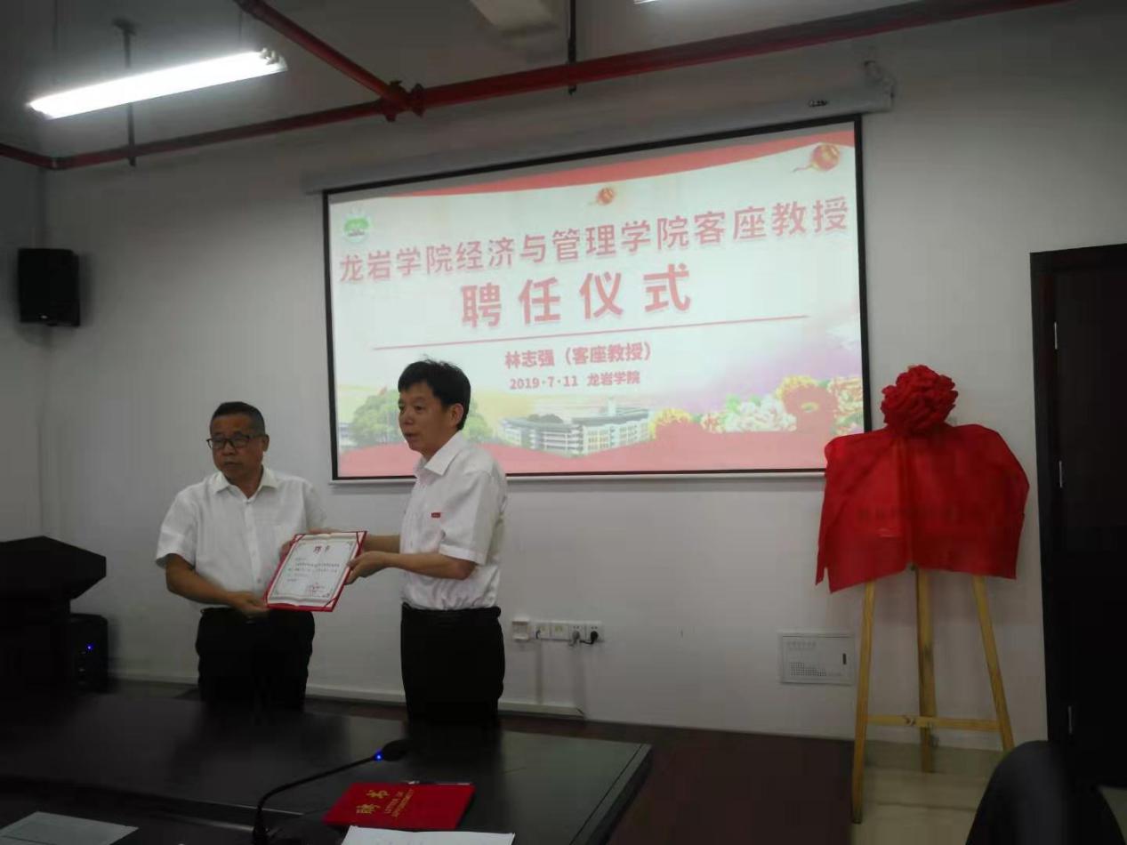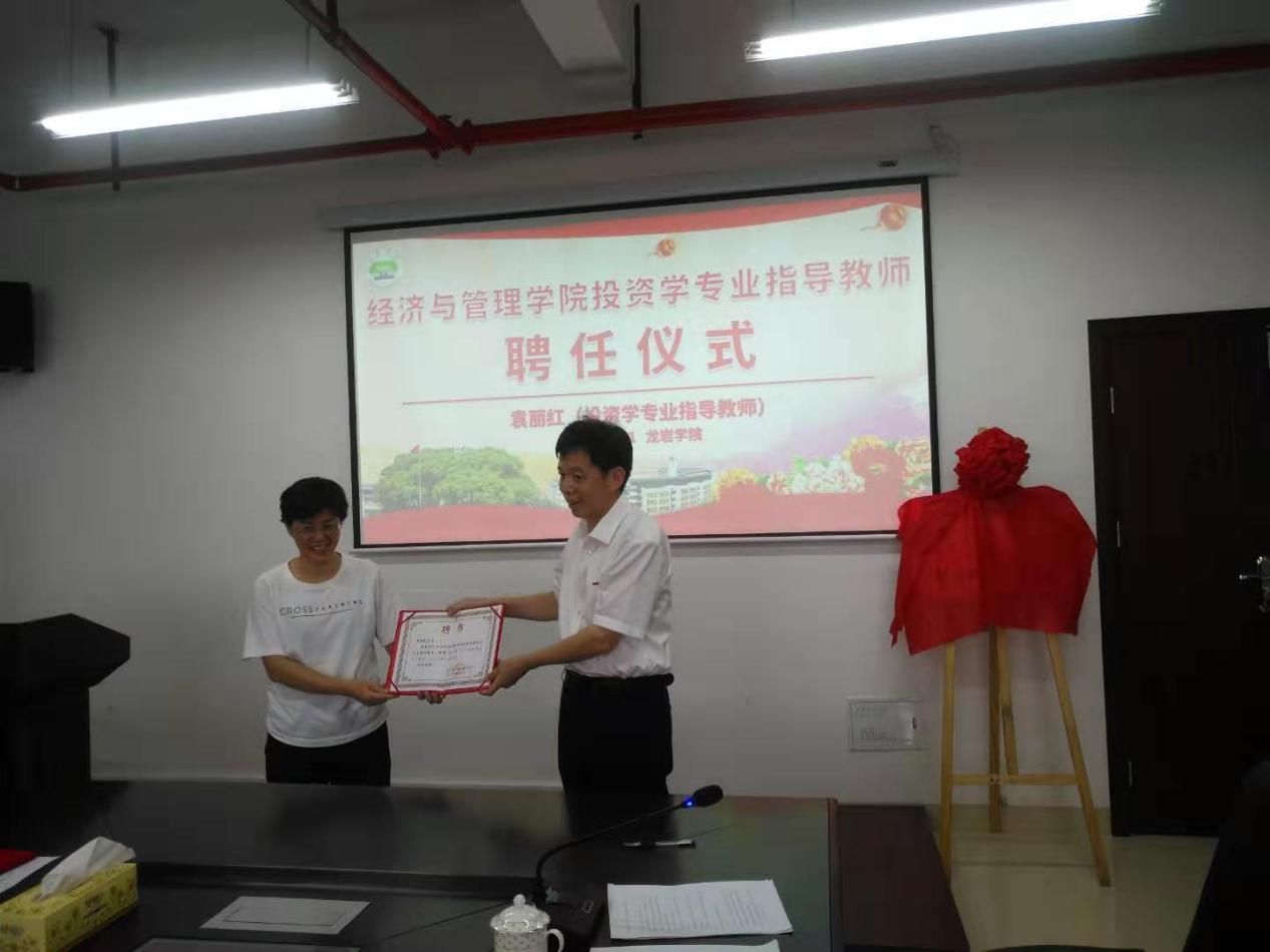 其次,院党委书记戴腾荣向林志强(客座教授)、袁丽红(投资学专业指导教师)颁发聘书。