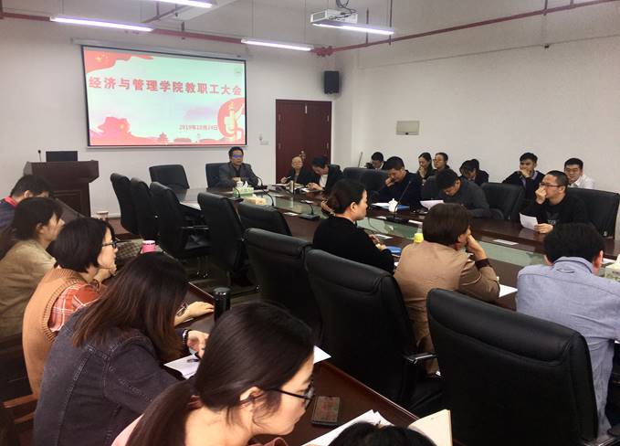 10月24日下午,经管学院在厚德楼619会议室召开全院教工大会。会议由院长蔡立雄主持,院党政领导和全院教工出席此次会议。