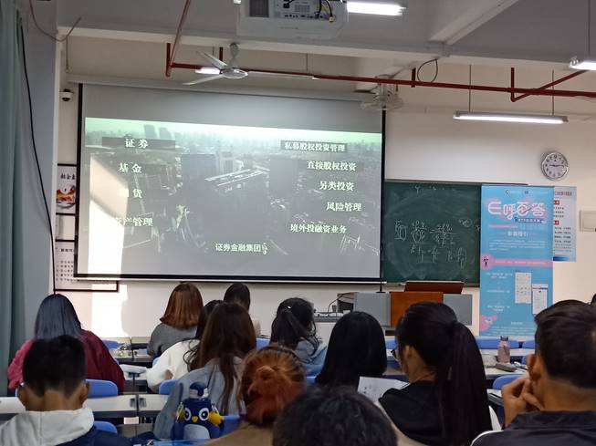 首先,兴业证券分公司总经理助理播放了一段视频,向同学们介绍了兴业证券的企业文化。随后他向同学们介绍了兴业证券与兴业银行的异同,解答了同学们的疑惑。紧接着由侯彬远向同学们介绍了本次宣讲主题ETF。侯老师先是详细介绍了ETF的基础概念,然后向同学们分析了ETF的发展现状,最后对ETF风险进行划分