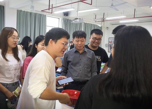 活动开始前,由经管学院团委负责人详细介绍博饼活动的游戏规则,以及对应的奖品分配。准备就绪后,学生开始按组进行博饼。每个小组环绕着骰盅进行投掷,现场气氛热烈,充满了大学生的蓬勃与朝气。戴腾荣与学生相处融洽,形成师生和睦、愉快温馨的氛围,展现了课堂外良师即是益友的美好场景。